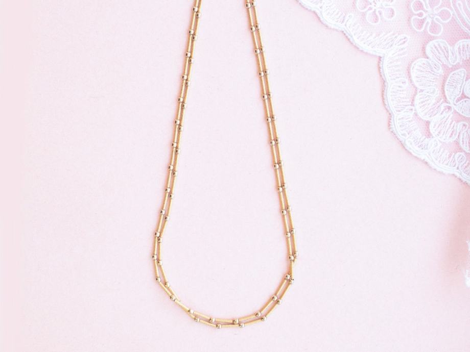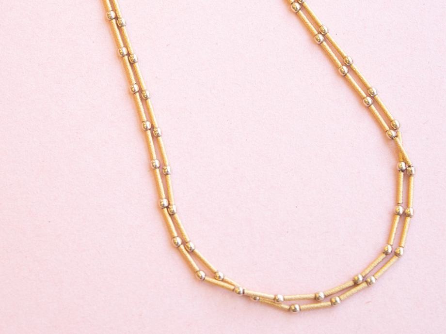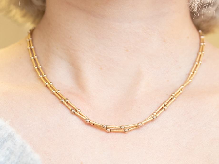 Zlatna ogrlica, ženska, kombinacija žuto-bijelo zlato 18K, štambilj 750, mat štapići + glat kuglice, dvostruka.