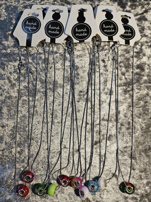 Prodajem komplet od 10 ogrlica u različitim bojama. Ogrlice su ručno rađene, svaka s jedinstvenim privjeskom u raznim nijansama - crvena, zelena, ljubičasta, crna i druge boje. Lanac je tanki, a privjesci imaju okruglu formu.