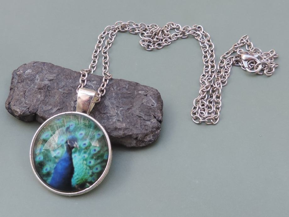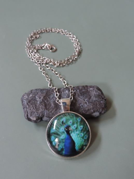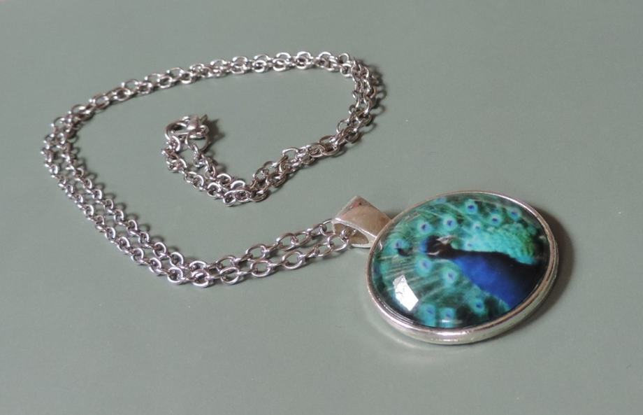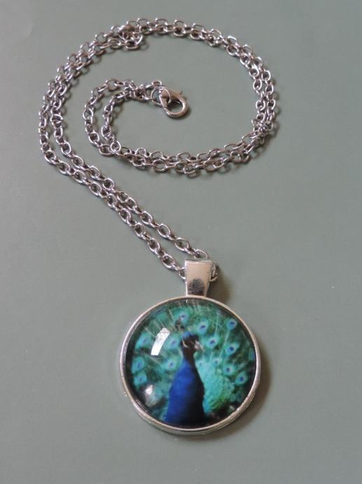 Privjesak/medaljon sa slikom pauna na srebrnom lančiću - dominiraju plavi i zeleni tonovi, a dinamiku pojačavaju predivne šare na paunovu repu.