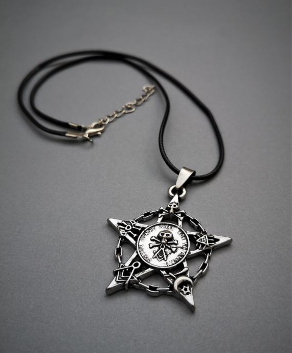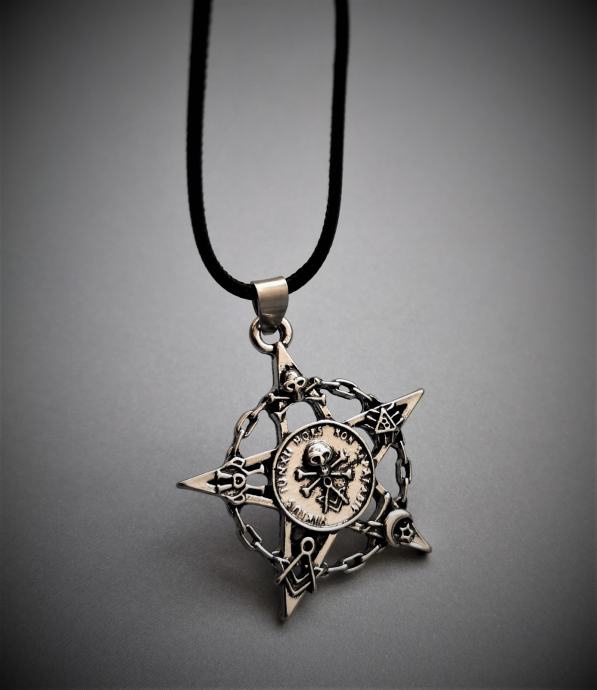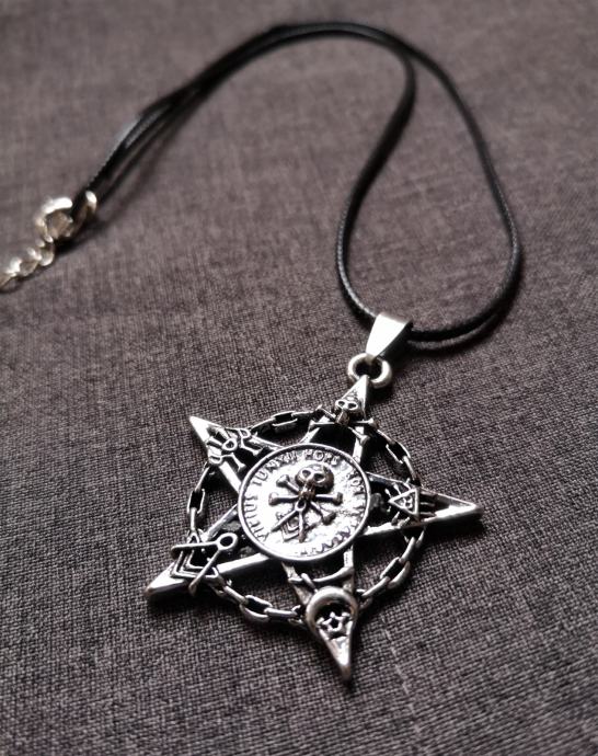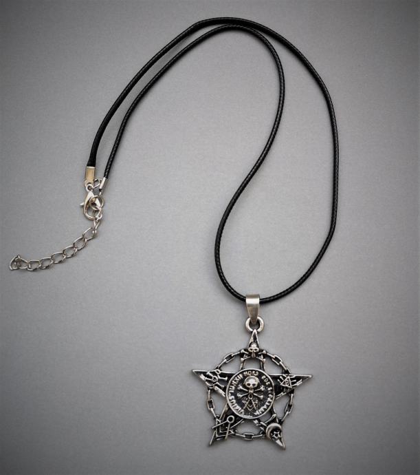 Moćna ogrlica s masivnim privjeskom čiju bazu čini pentagram ukrašen odličnim detaljima i simbolima.