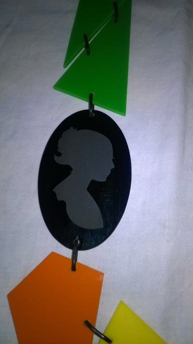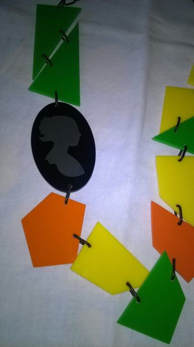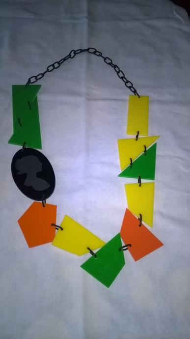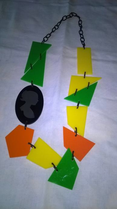 Plastična ogrlica, veselih boja. Osvježava svojim izgledom svaku kombinaciju i potiče dobro raspoloženje. U nizu ogrlice nalazi se dio sa ugraviranom minijaturom ženske glave, što ogrlici daje dozu elegancije i ženstvenosti. Ogrlica je prikladna za sve kombinacije - od jeansa pa do male crne haljine.