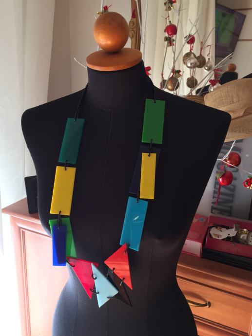 Prodaje se unikatna, ručno rađena PLASTIČNA OGRLICA, sastavljena od raznobojnih dijelova od pleksiglasa. Dijelovi su u različitim oblicima, a sastavljani su međusobnim spajanjem alkicama. Svi su dijelovi ručno obrađeni, a cijela ogrlica je ugodna za nošenje. Ogrlica se završava crnim alu-lančićem, koji ne izaziva alergije. Na ovoj ogrlici su dodana dva raznobojna oblika, radi interesantnijeg izgleda.