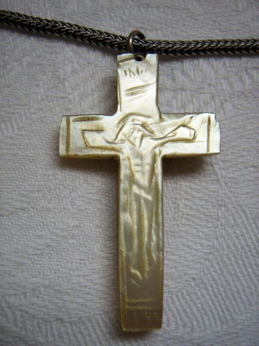 Raspelo rad starih dalmatinskih zlatara dimenzija 3,5 cm x 2 cm x 4 mm debljine ručni rad madreperla iznutrica školjke jako zahtijevna i teška tehnika rezbarenja i obrađevanja