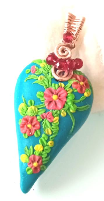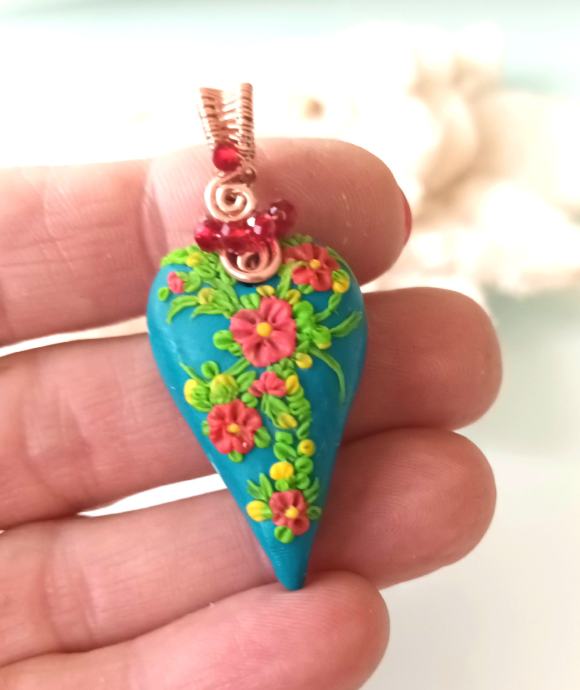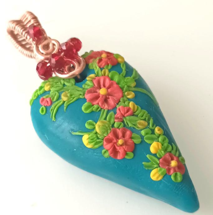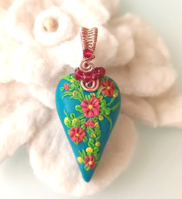 Privjesak u obliku srca izrađen od polimerne gline. Svaki dio cvjetića i listica je ručno raden i apliciran na podlogu uz pomoć sitne iglice. Dio za lancic izrađen je od bakrena žice. Unikat