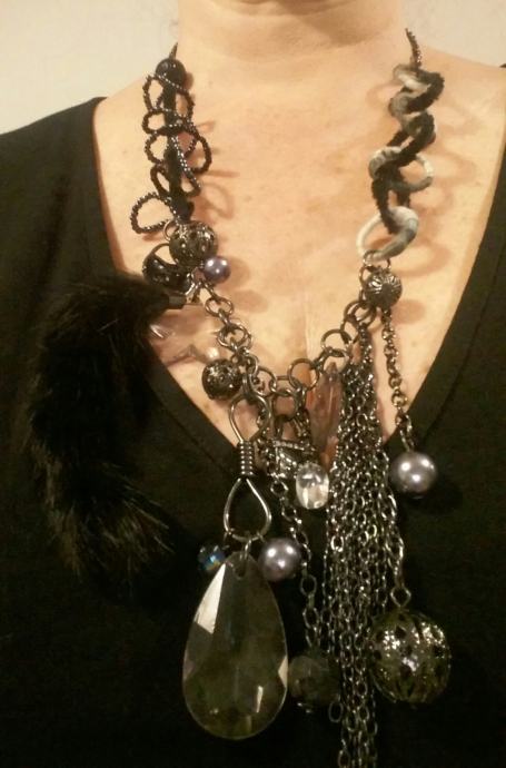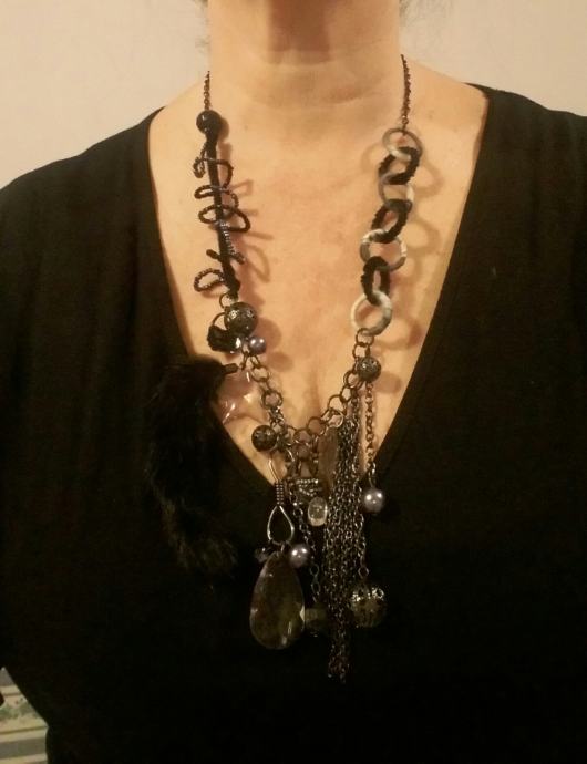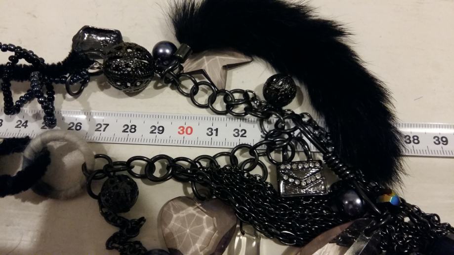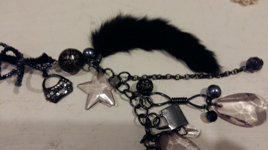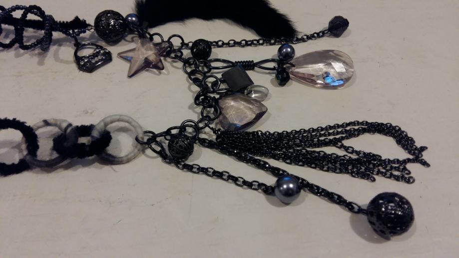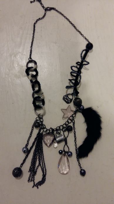 Prodajem prekrasnu ogrlicu crne boje s raznim privjescima i dodacima. Moze se jos 5 cm produzit.