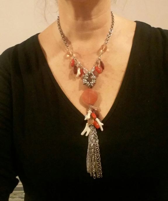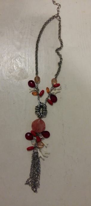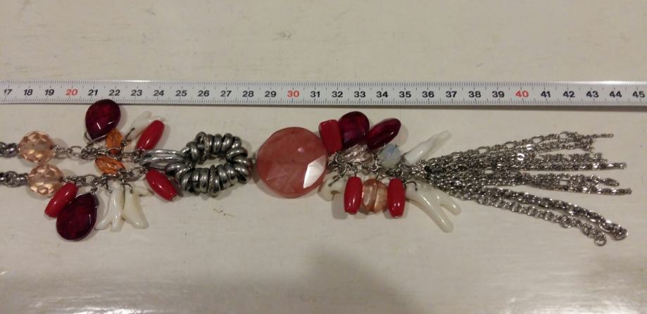 Prodajem efektnu ogrlicu srebrene boje sa privjescima u crvenoj i bijeloj boji. Savršeno stoji! Moze se produžit za 5 cm.