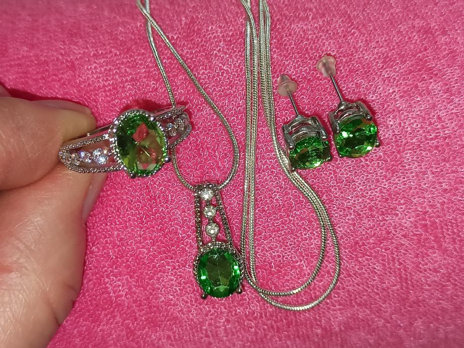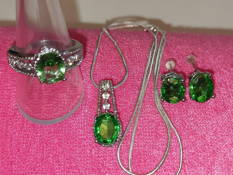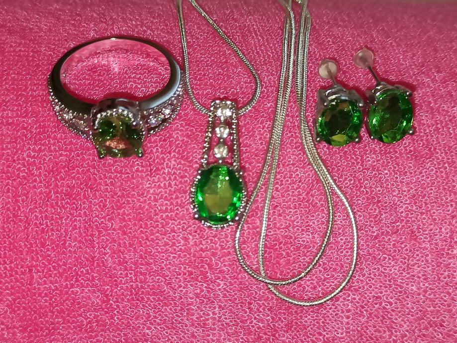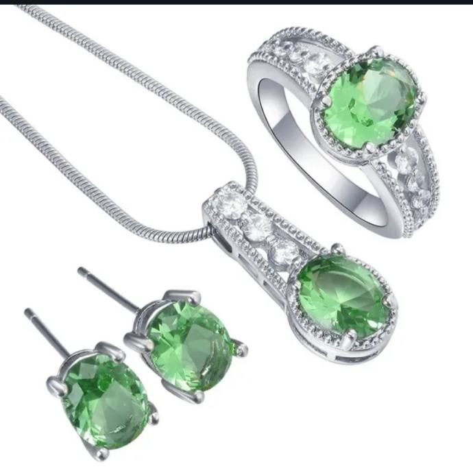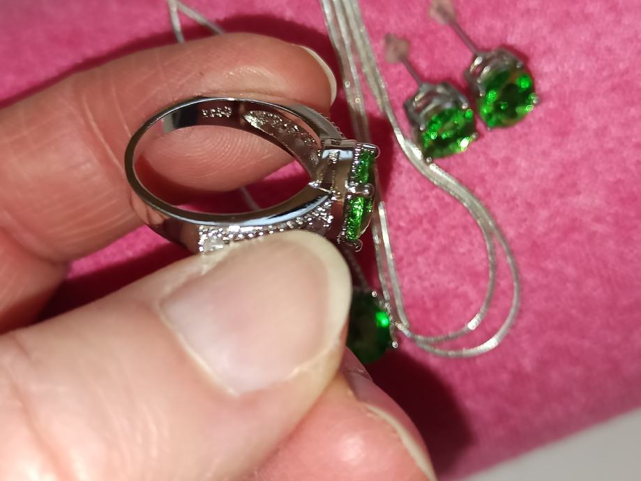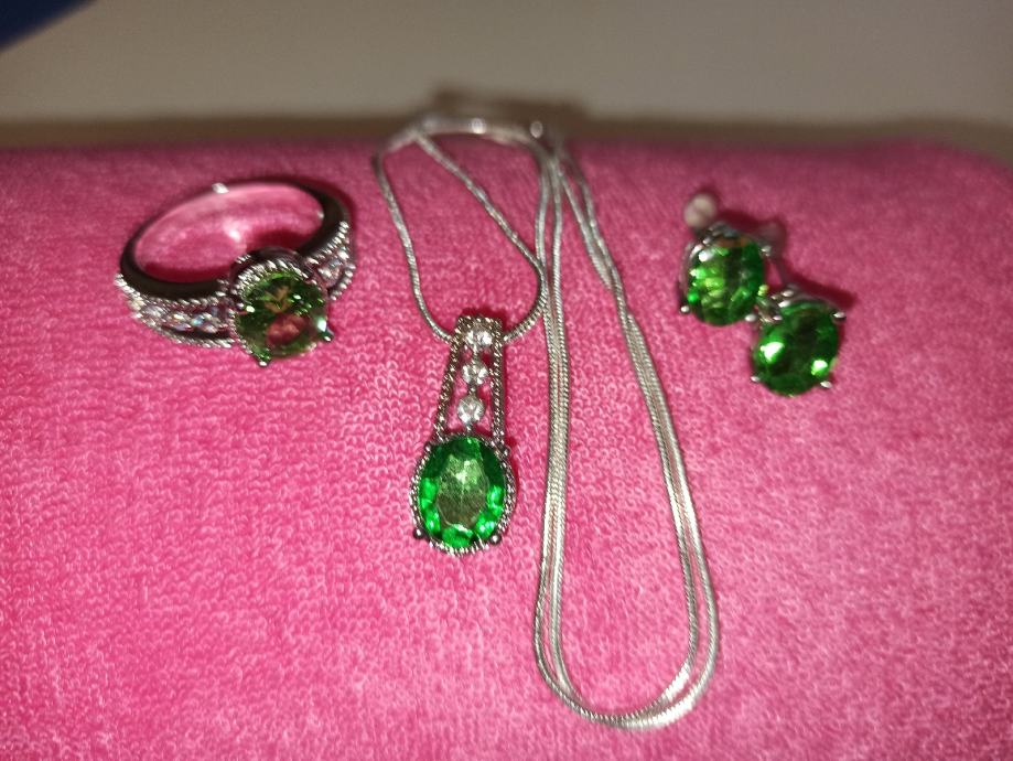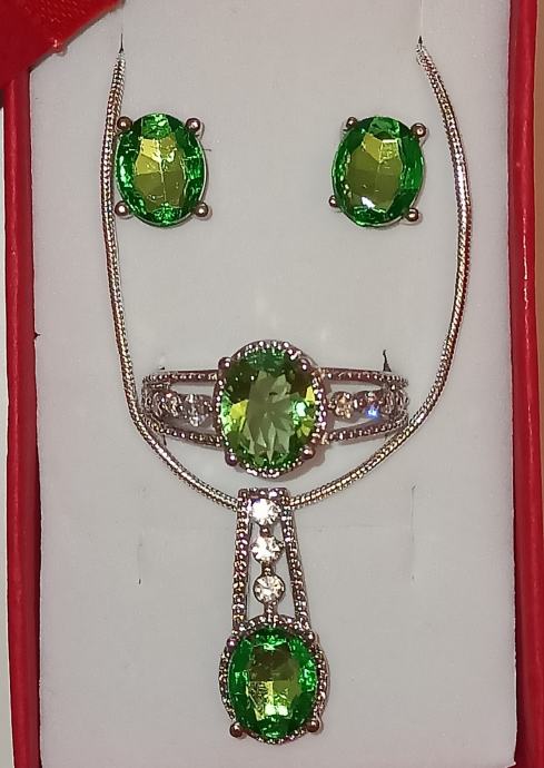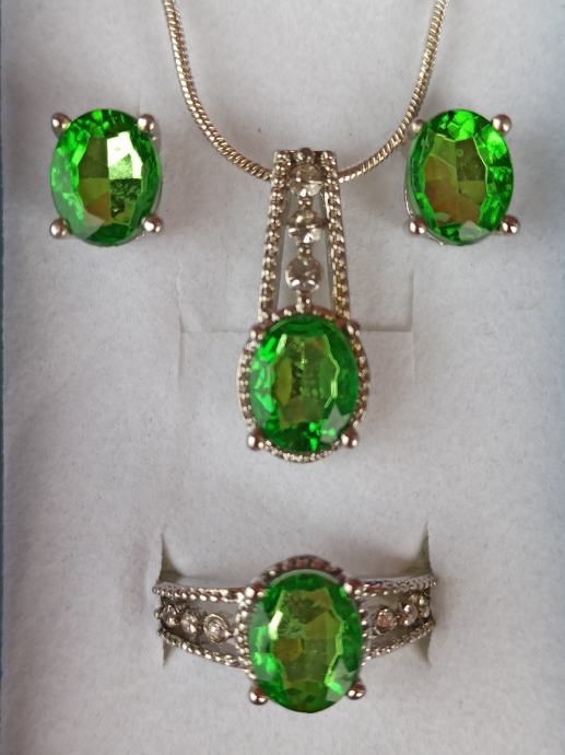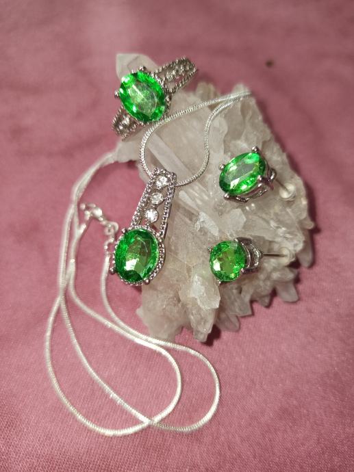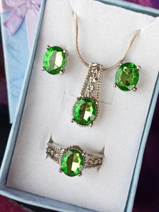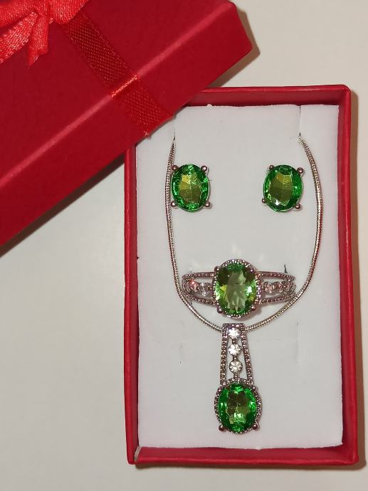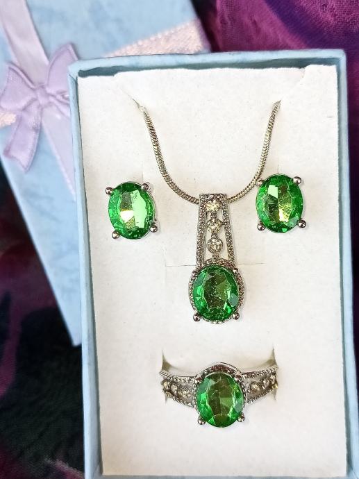 Prekrasan komplet sa kamenjem (kubični cirkoni) u božanstvenoj zelenoj boji: privjesak na lančiću 22 inča, prsten i naušnice, sve kvalitetno posrebreno 925 srebrom sa žigom, ne reagira na magnet, prsten veličine br 9 - 18,9 mm; sve u divnoj poklon kutijici za najdražu damu.