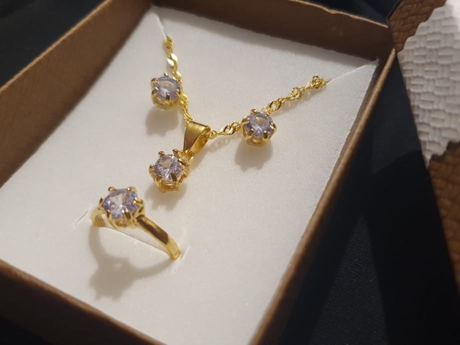 U zlatnoj boji, sa cirkonom. Dužina lančića je 41 + 5 cm. Prsten je vel.7. U kutijici.
