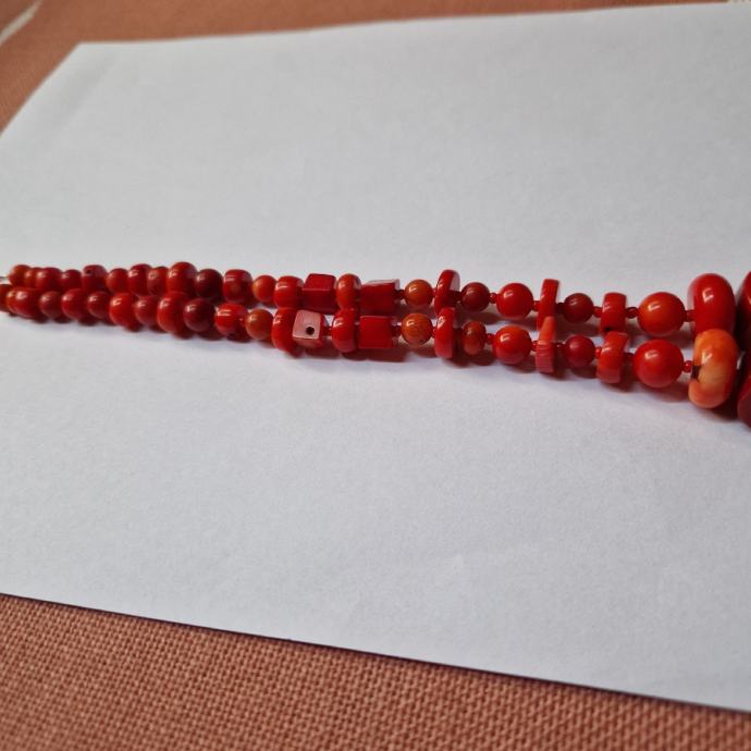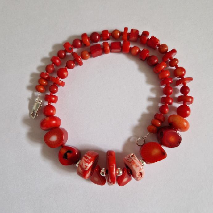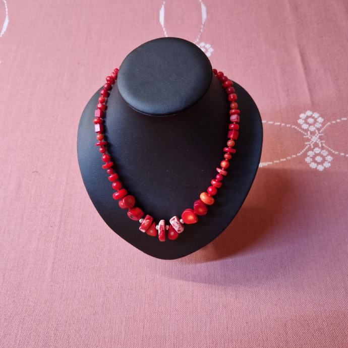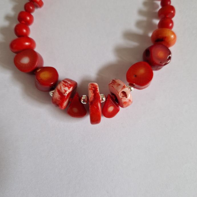 Oglica je izrađena od crvenog koralja ,središnje perle prošarane rozim koraljem. Ogrlica je unikat Četiri središnje male kuglice srebrnog sjaja su od čelika, kopča sa završnim djelovima je od srebra 925.Duljina ogrlice je 49cm.