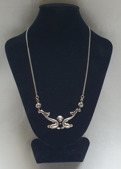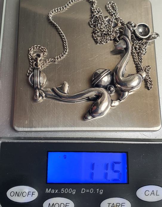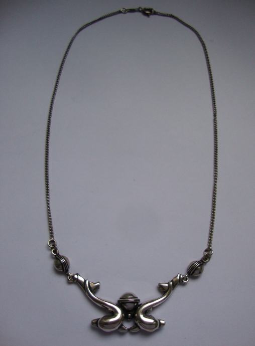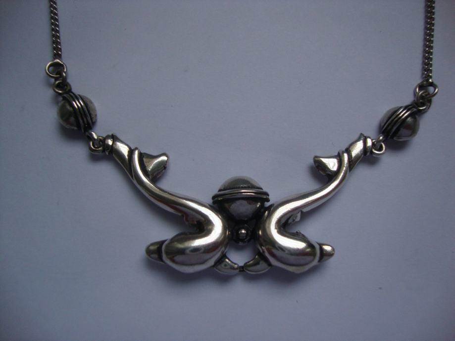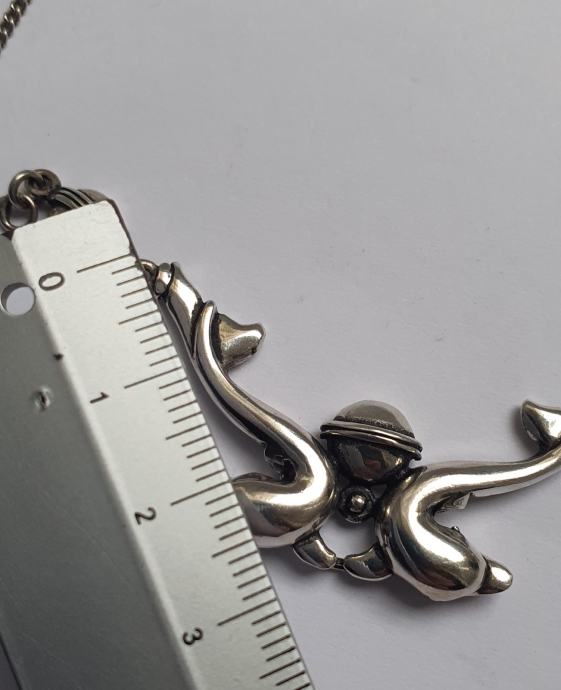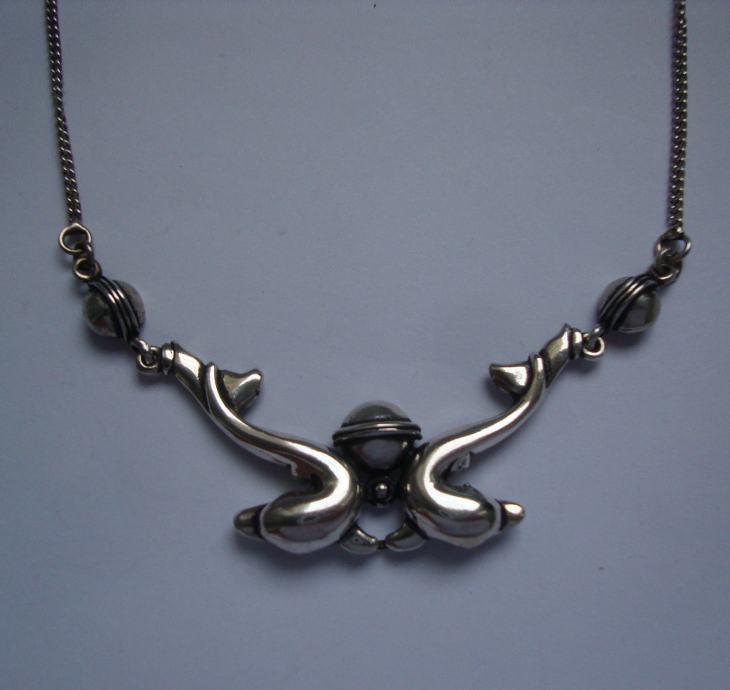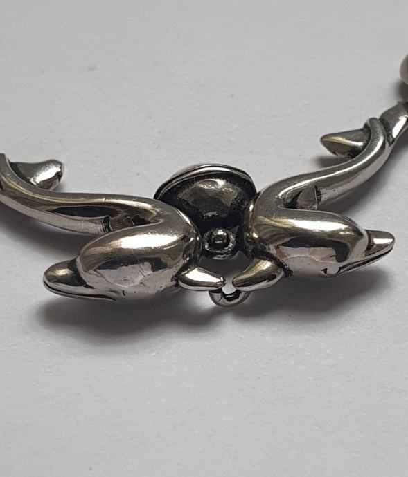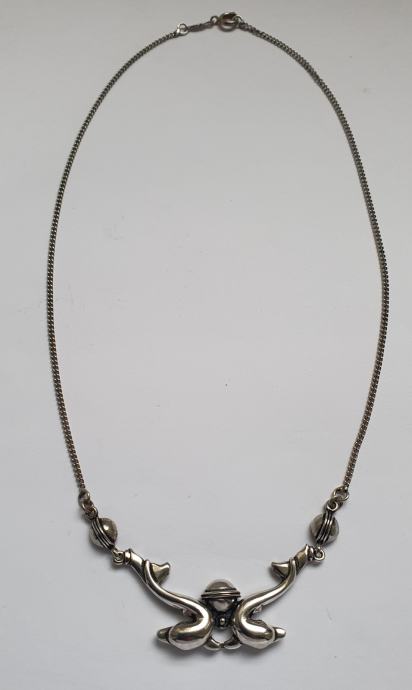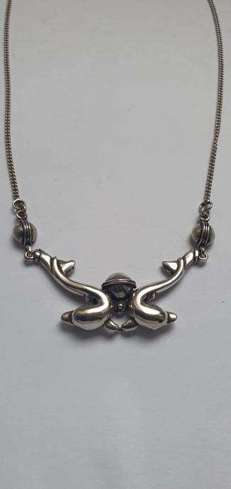 Dizajnerski potpisan ručni rad veliki raskošni privjesak dupina u igri izrađeno u srebru visoke čistoće 950 iza je žig i potpis majstora a iz privjeska se nastavljaju lanci pancir vez u srebru 925 te je ukupna duzina ogrlica 46 cm