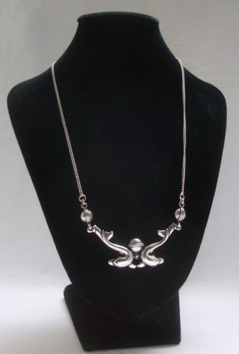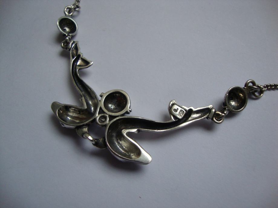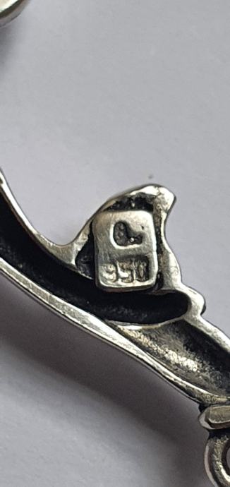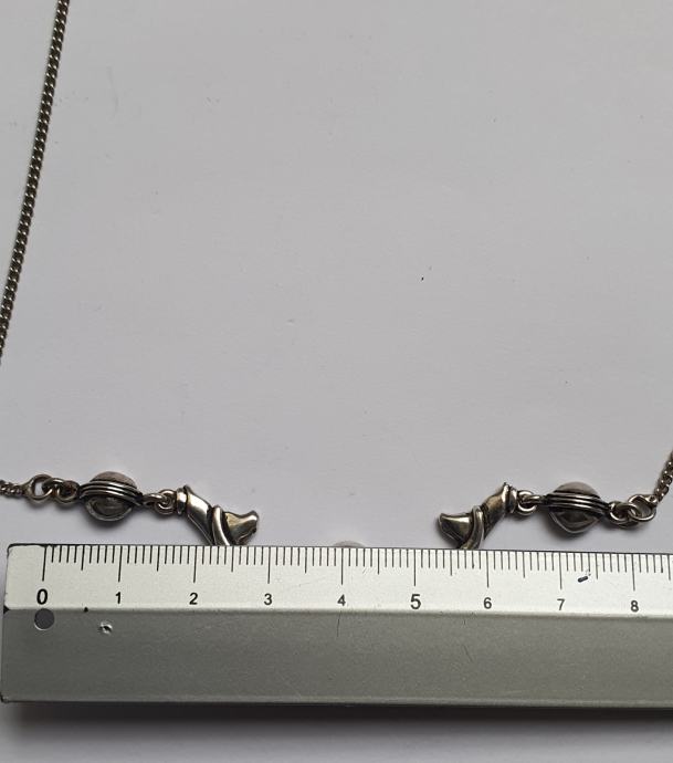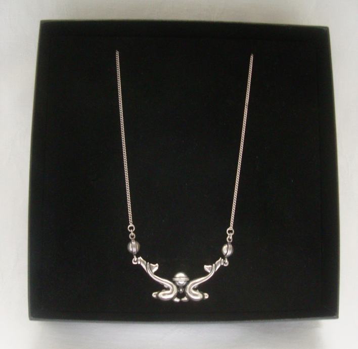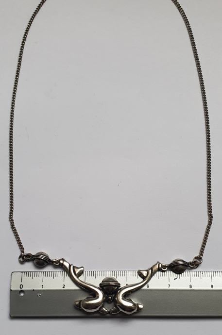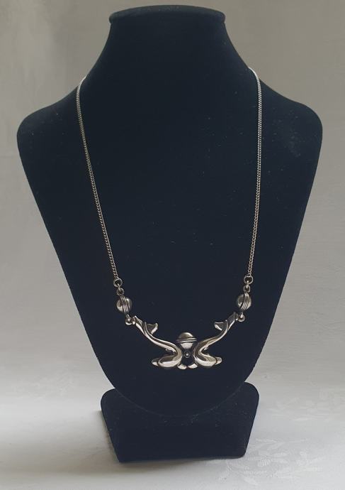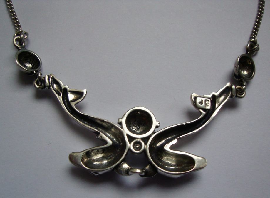 Dizajnerski potpisan ručni rad veliki raskošni privjesak dupina u igri izrađeno u srebru visoke čistoće 950 iza je žig i potpis majstora a iz privjeska se nastavljaju lanci pancir vez u srebru 925 te je ukupna duzina ogrlica 46 cm