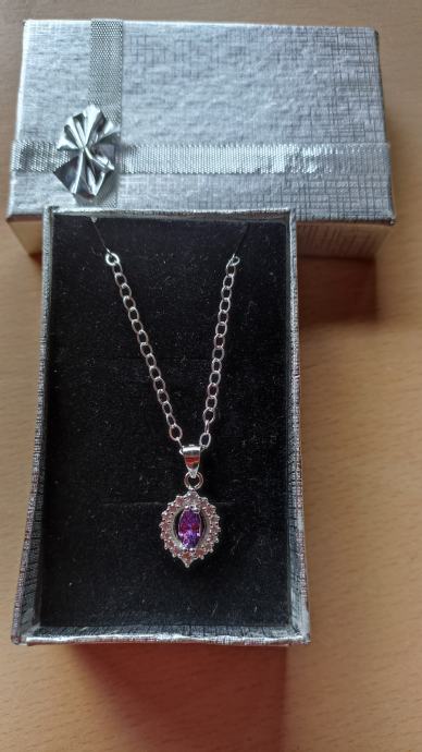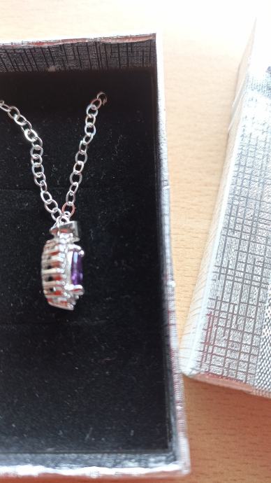 Srebrni lančić novi sa privjeskom ametista, žig čistoće 925, dužina lančića 45 cm, privjesak 15x10x5 mm,