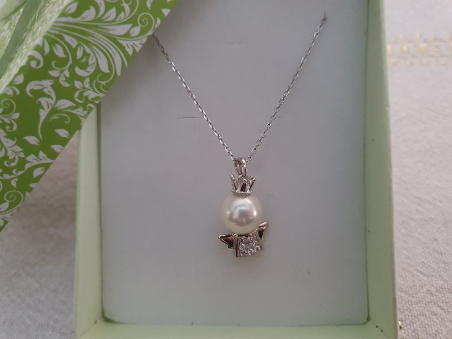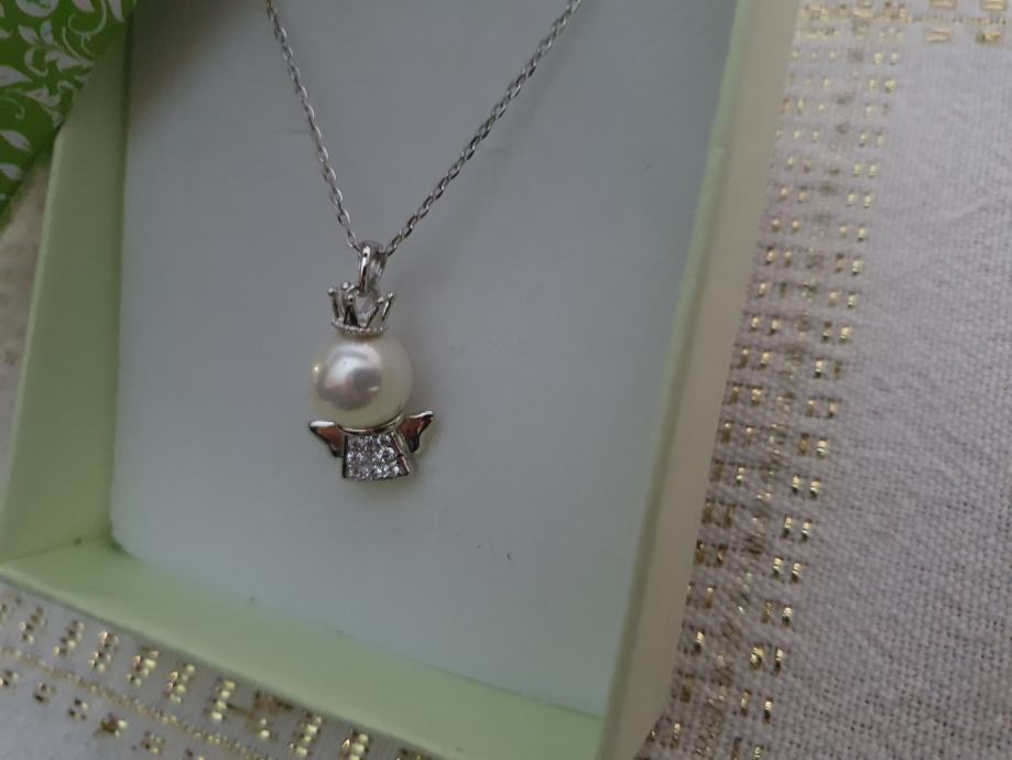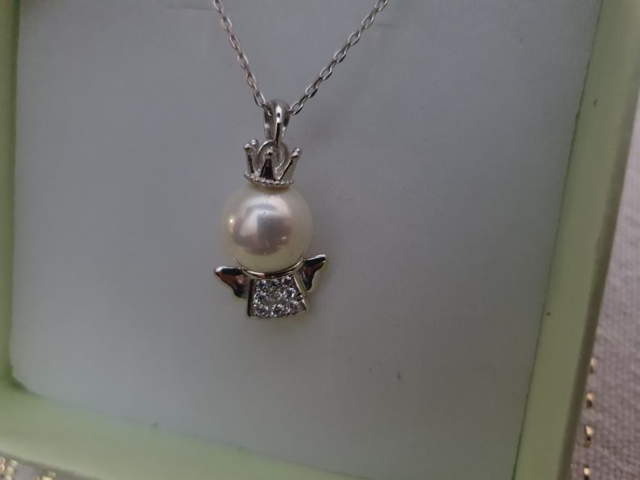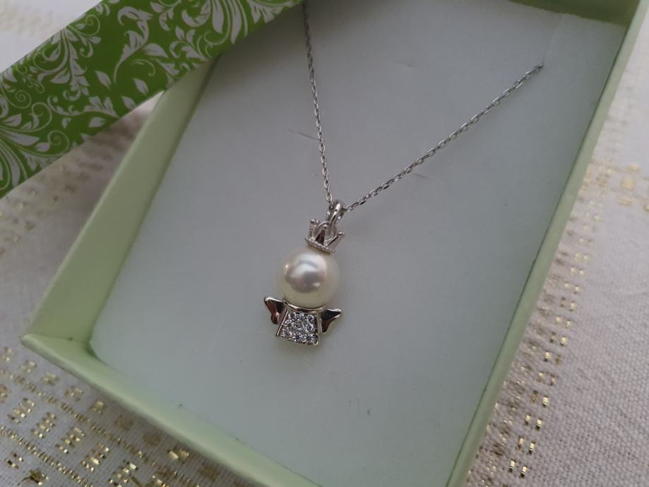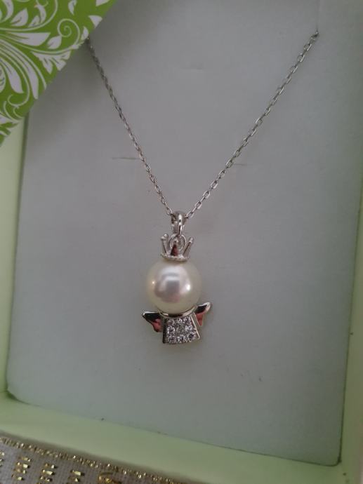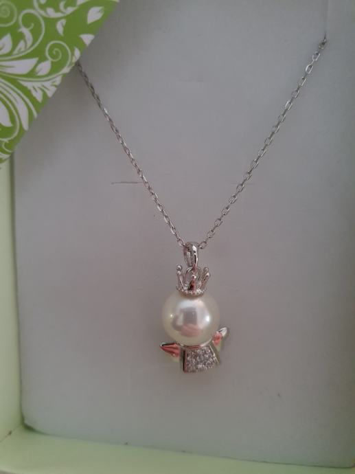Lančić anđeo srebro 925 s biserom, žig 925 na privjesku i na lančiću, dužina lančića 45 cm, veličina privjeska 2,5*1,3 cm, vrlo efektnog i dojmljivog izgleda