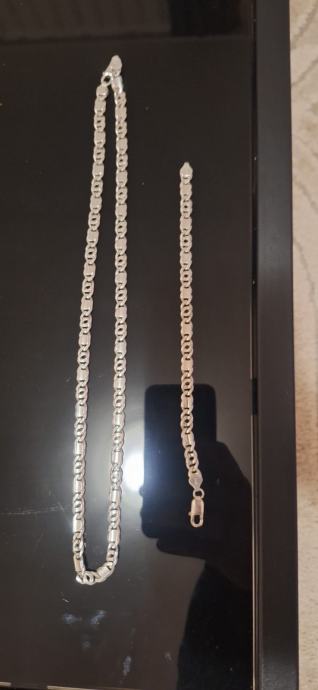 Prodajem srebrni lančić od srebra s karakterističnim plosnatim karičicama. Lančić je izrađen od srebra i dolazi u kompletu s narukvom istog dizajna i materijala.