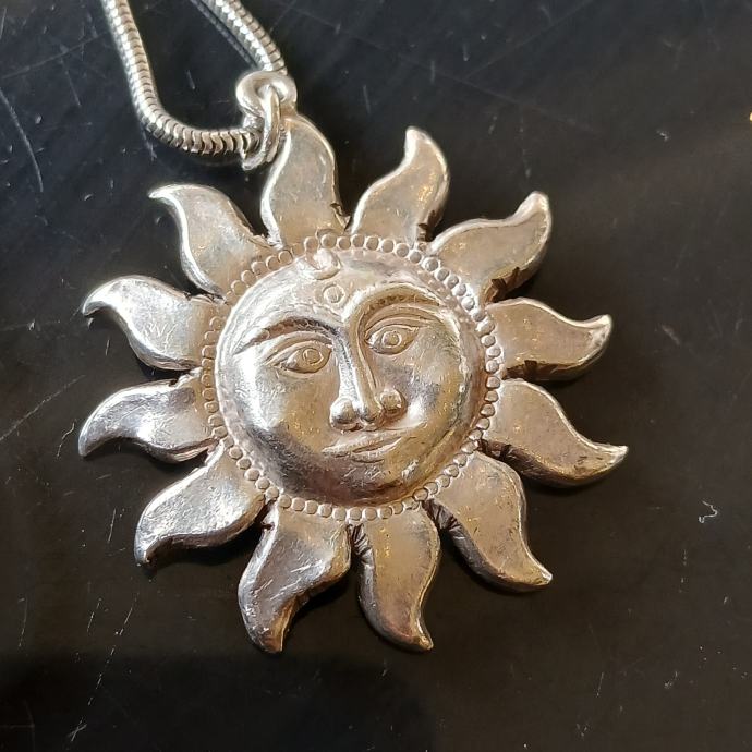 Srebrni lančić s privjeskom sunce, malo je oštećen s donje strane, potreban je popravak