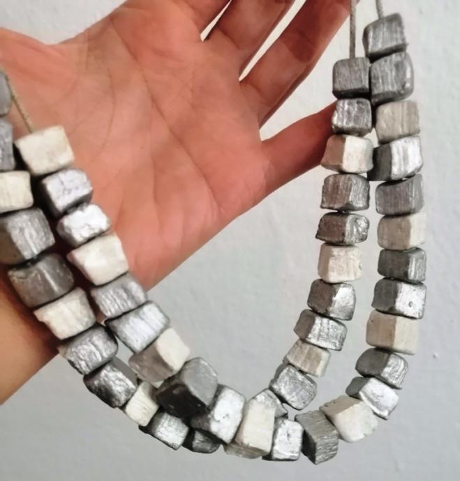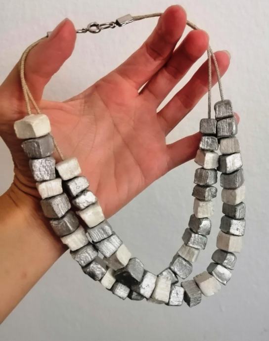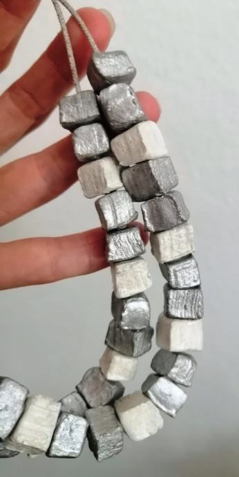 Načinjena od bijelih i srebrnih nepravilnih kockica gline.