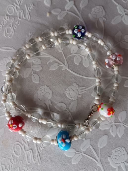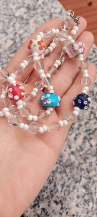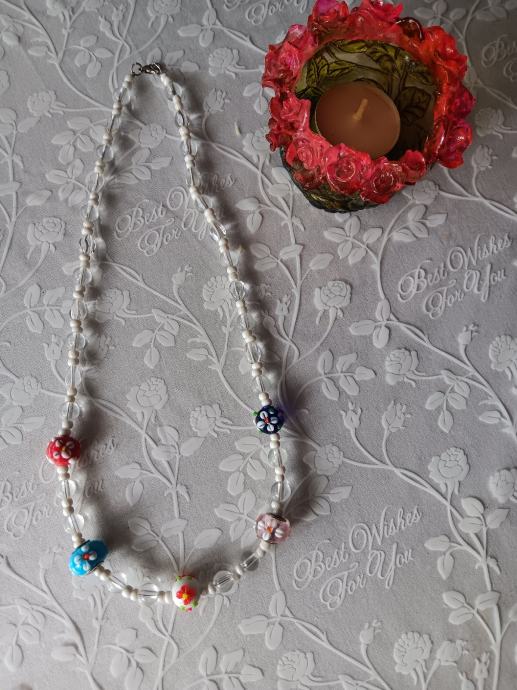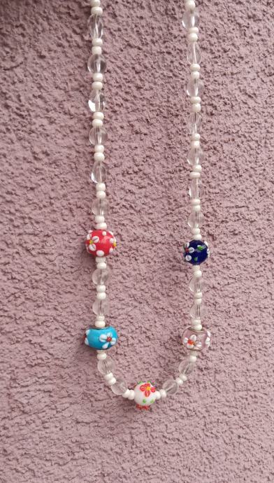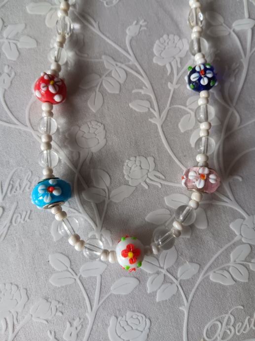 Prozirno - bijela staklena ogrlica, u sredini 5 cvjetnih "murano" perlica. Dužina - 53 cm. Novo, unikat.