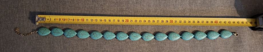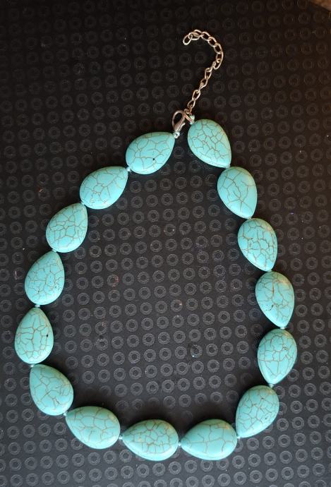 Prodajem tirkiznu ogrlicu izrađenu od kapljičastih perli s uzorkom pukotina. Ogrlica je u odličbom stanju, s metalnim lancem za kopčanje. Izražajan je i upečatljiv komad nakita koji će upotpuniti svaku odjevnu kombinaciju.