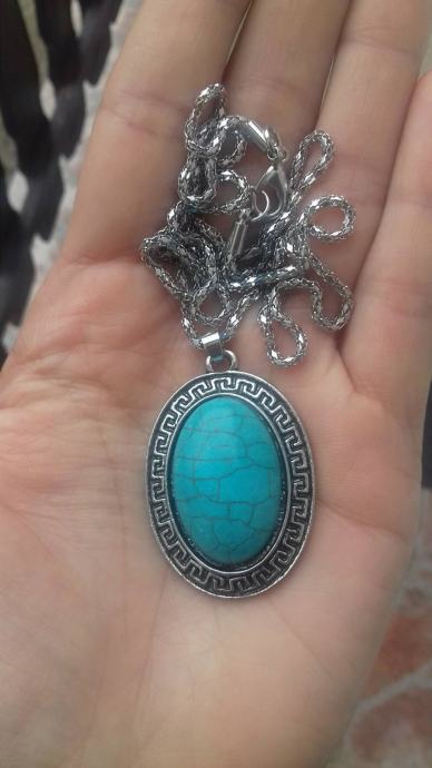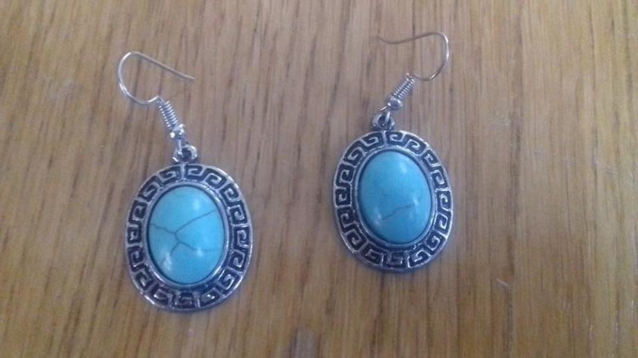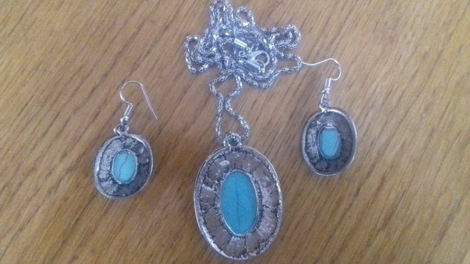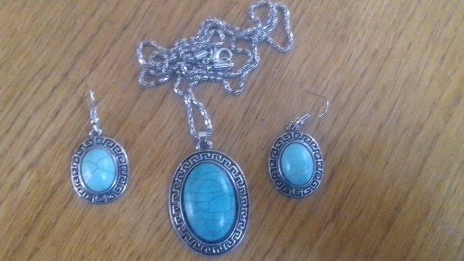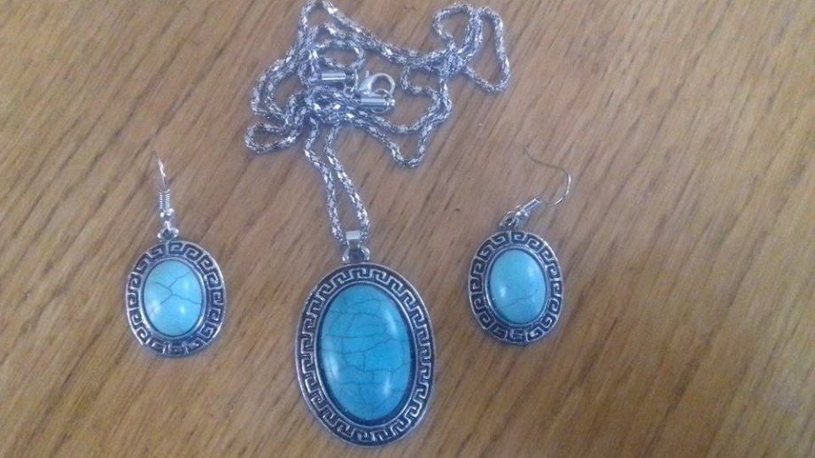 Tirkizni komplet, novi, naušnice+ogrlica, nikada nošeni, oko tirkiznog kamena je grčki motiv. Nakit je lagan. Lančić je duži.
