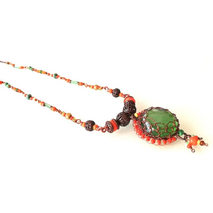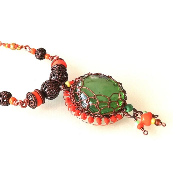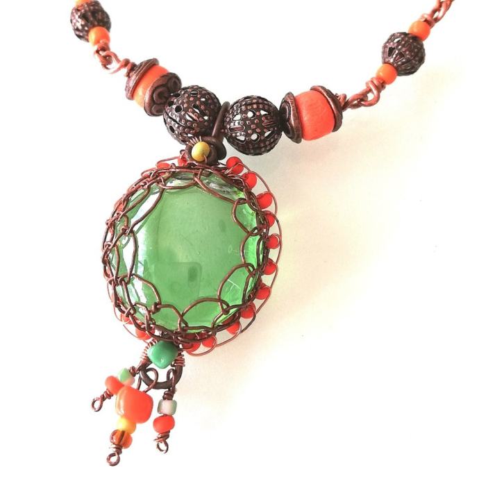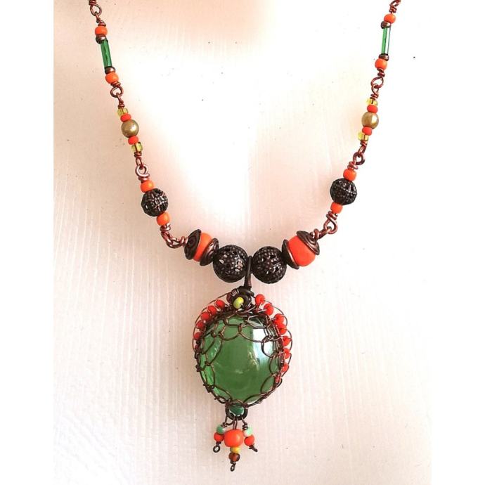 Žicom opleteni stakleni privjesak. Unikatna kraća ogrlica. Ručni rad.