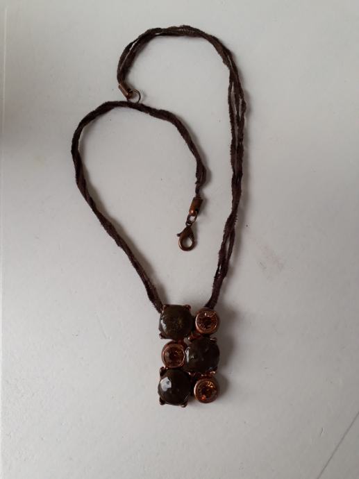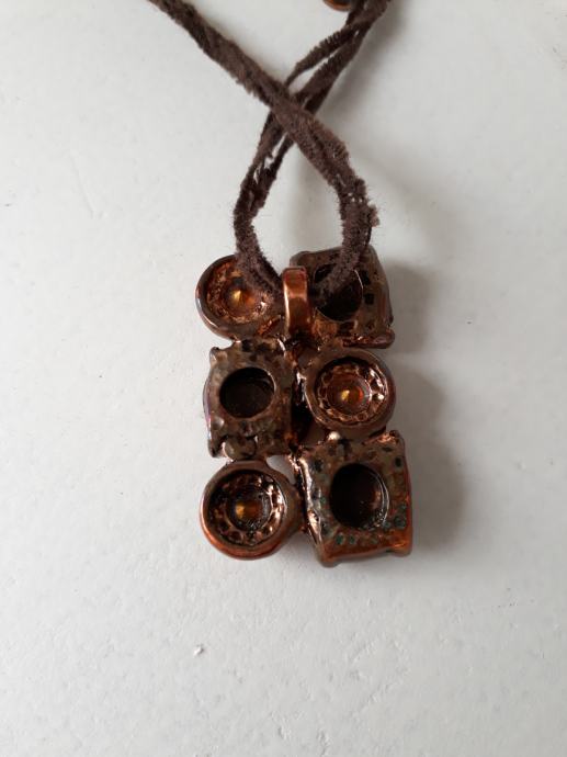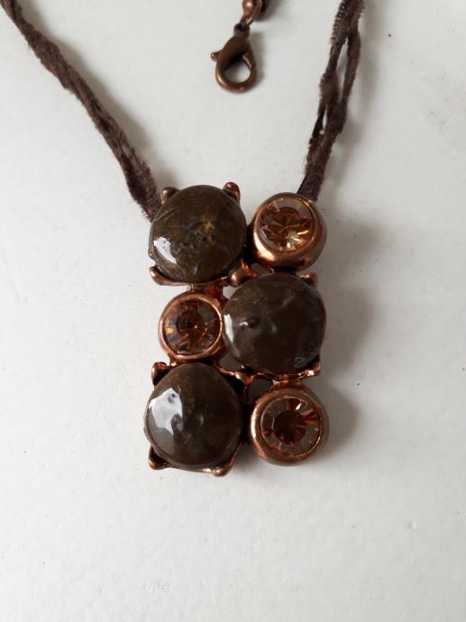 Privjesak - na podlozi od metala umetnuti smeđi kristali i keramika.