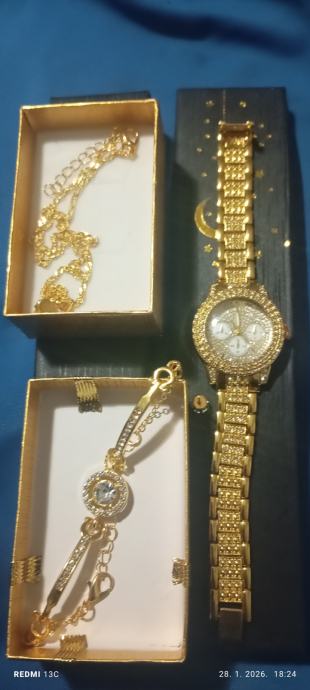Ženski sat+lančić,prsten,narukvica,naušnice + 2 ukrasne kutije.