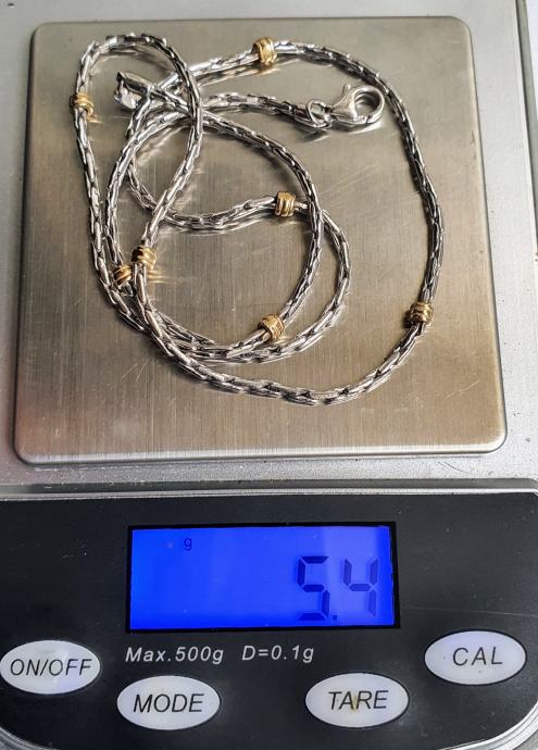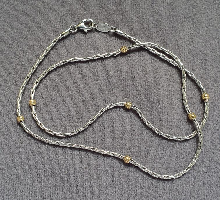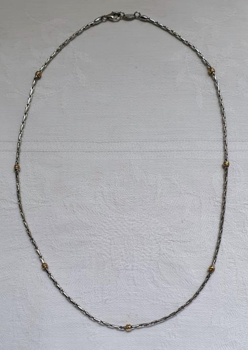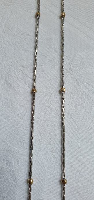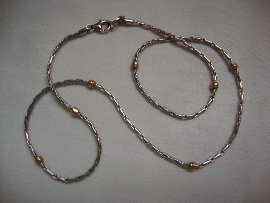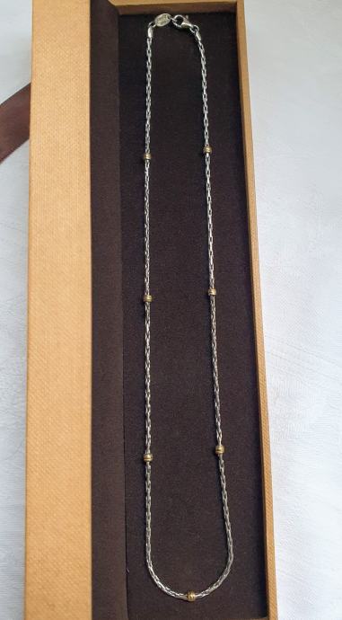 Krasna vintage zlata ogrlica poznate talijanske dizajnerice G.B.(Gabrielle Bruni) izrađena je od 585 bijelog zlata u kombinaciji sa žutim zlatom ukrasnih 7 kuglica ukupne dužine 43,5 cm debljine 2 mm kuglice 3/4 mm debljine