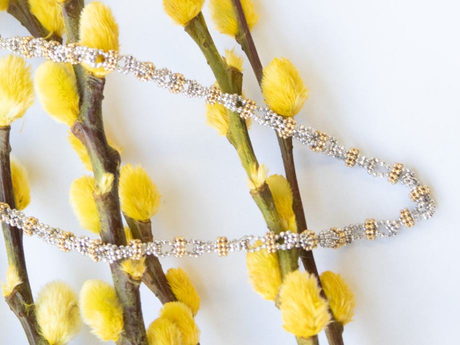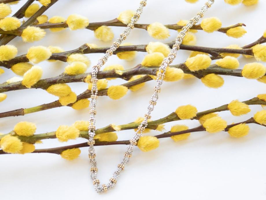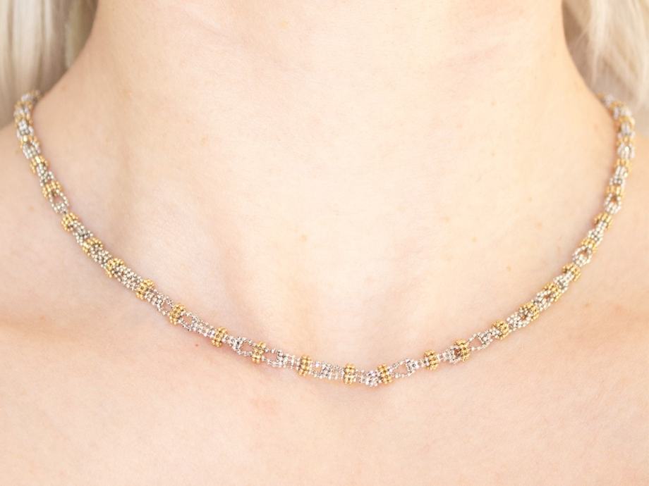 Zlatna ogrlica, ženska, lančić, kombinacija žuto-bijelo zlato 14K, žig 585, kombinacija žutih i bijelih minijaturnih kuglica povezanih u mrežu.