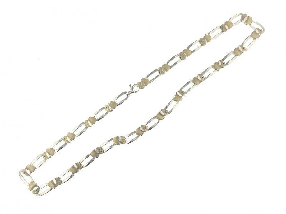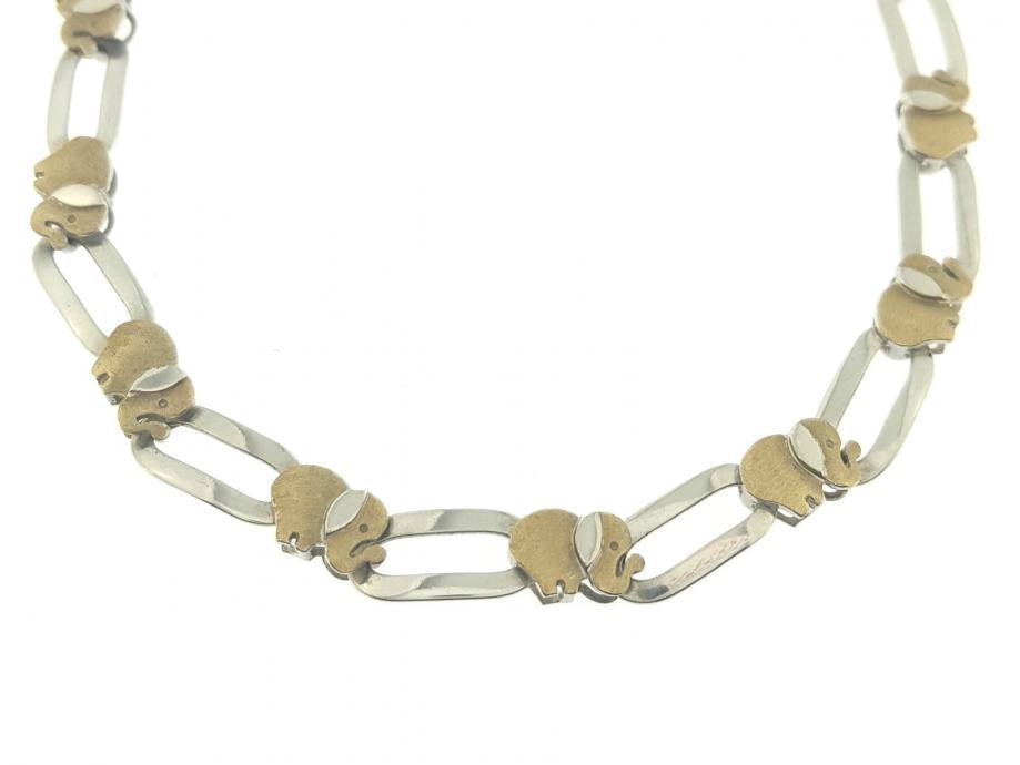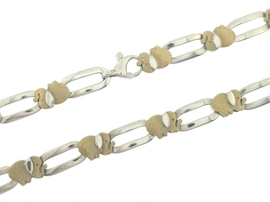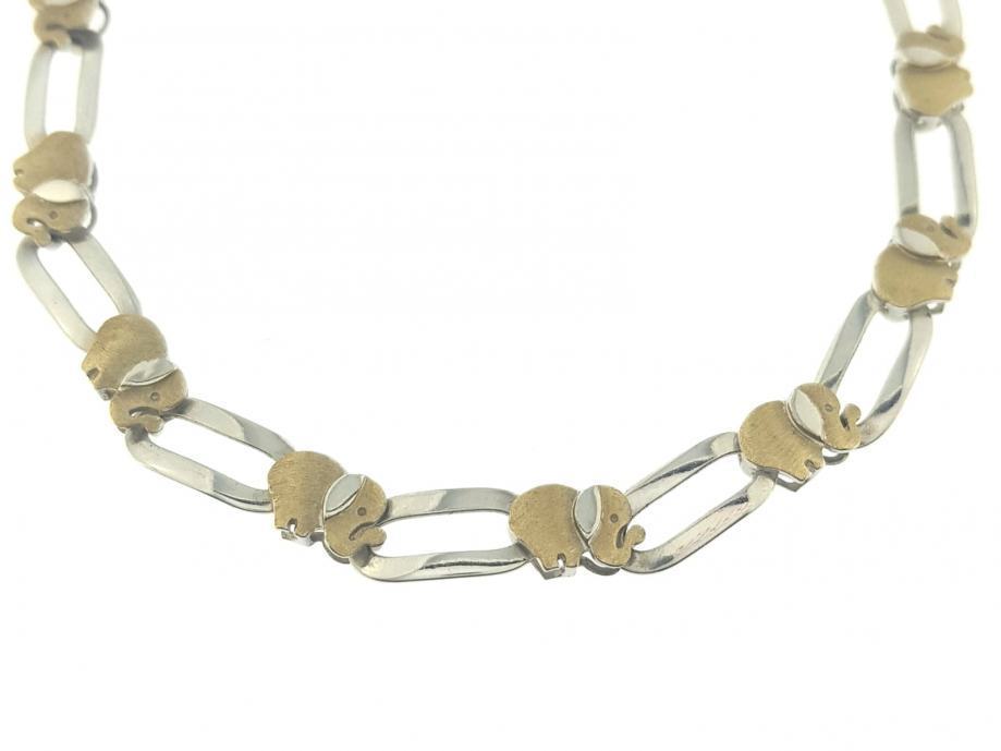 Zlatna ogrlica, ženska, kombinacija žuto-bijelo zlato 14K, žig 585, glat oble bijelo zlato karike, žuto zlato slonići.