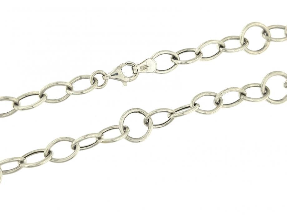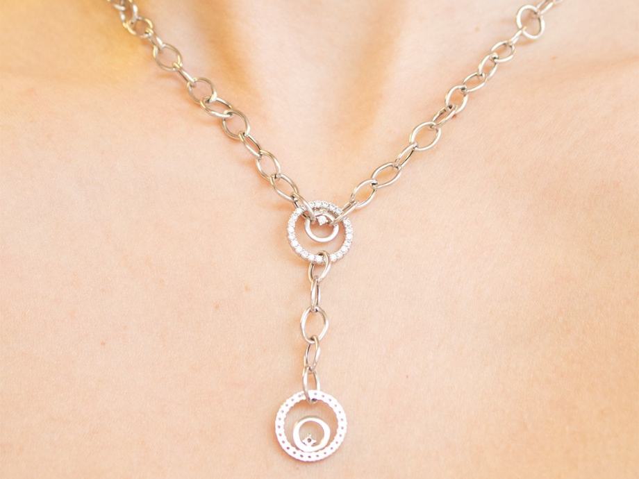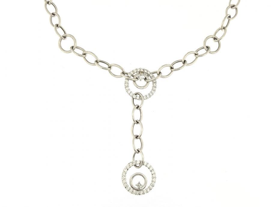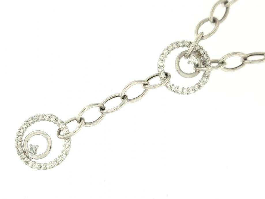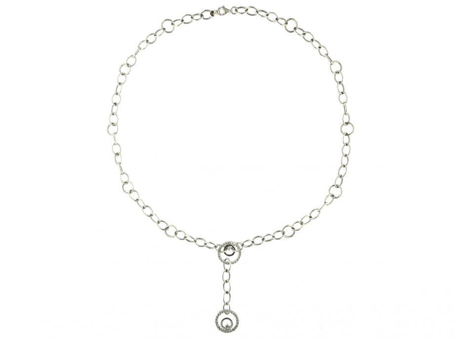 Zlatna ogrlica, ženska, lančić, bijelo zlato 14K, žig 585, šuplje okrugle i duguljaste karikice naizmjence + visuljak koji u krugovima sadrži bijele cirkone.
