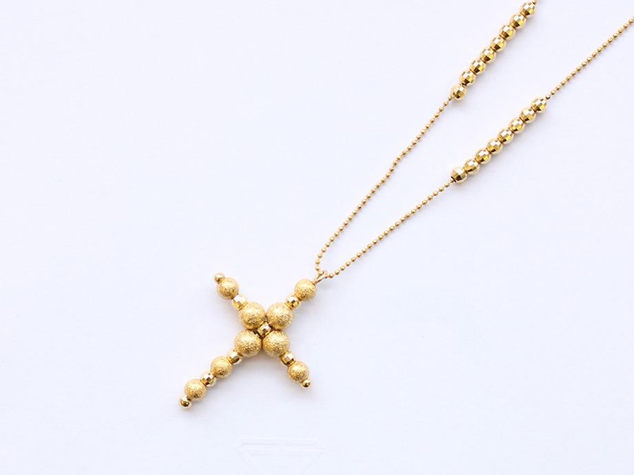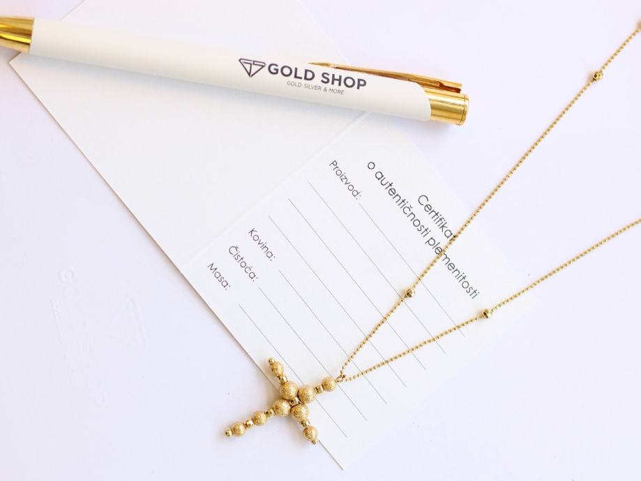 Zlatna ogrlica, žuto zlato, tanki lančić na kojem su sa svake strane križića po 8 većih pomičnih kuglica (veće kuglice klize po lančiću i mogu se premještati), 14K, štambilj 585.