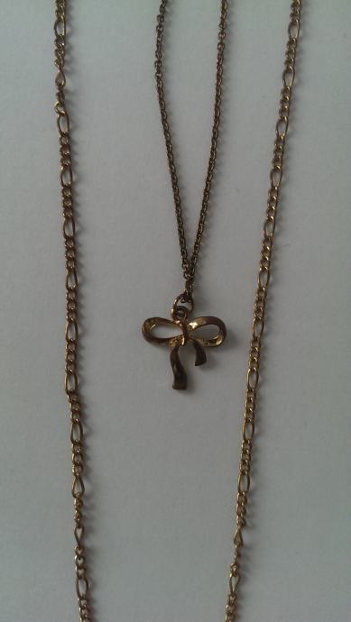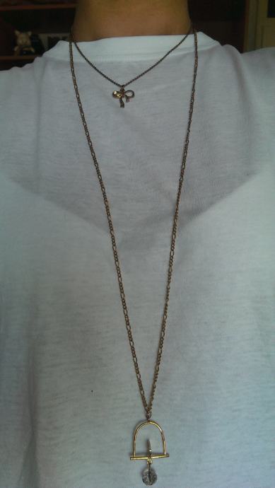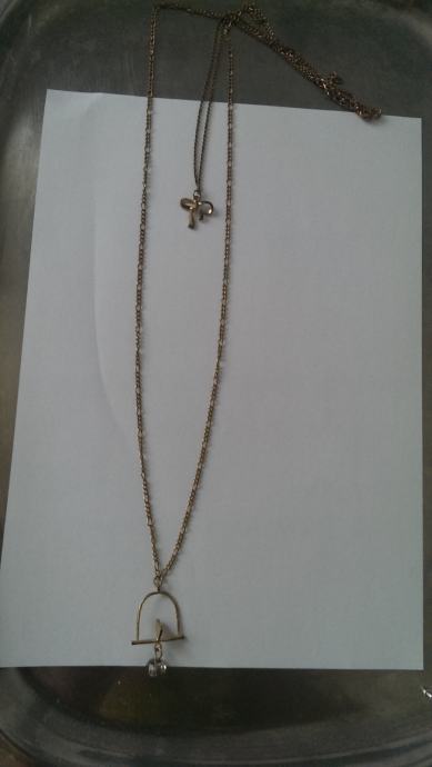 Dvostruka pozlaćena ogrlica, na jednoj privjesak je mašna a na drugoj ptica na krletki. Nešto duži lančić.