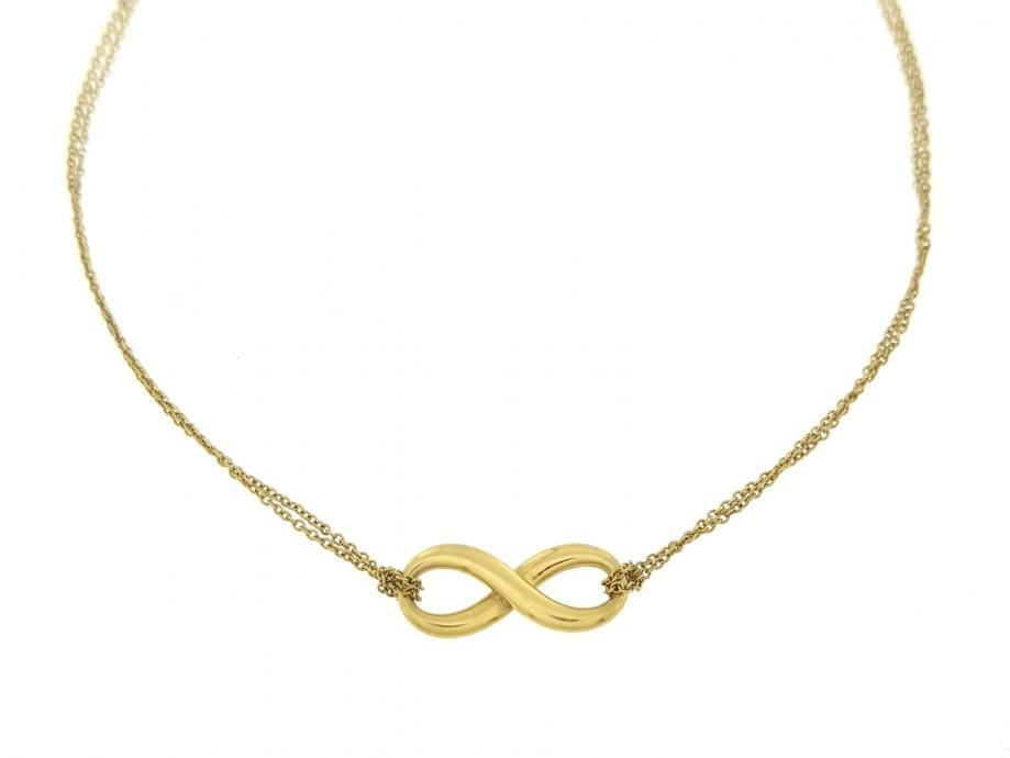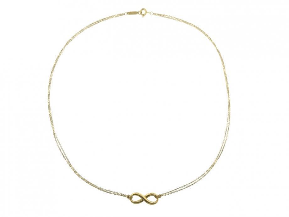 Zlatna ogrlica, ženska, žuto zlato 18K, štambilj 750, dvostruki tanki kare lančić, na sredini privjesak, glat, znak beskonačnosti.
