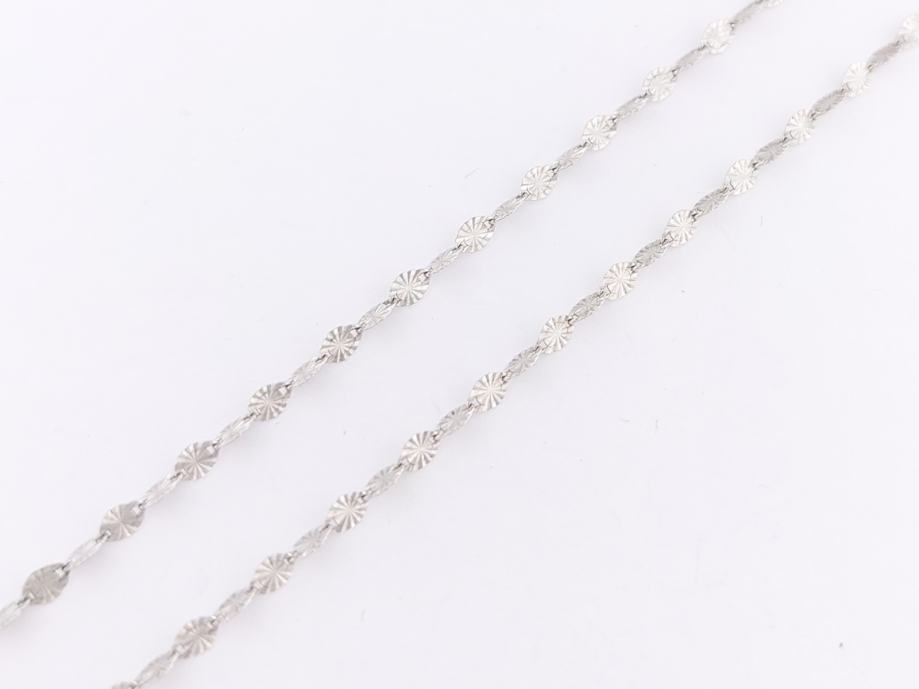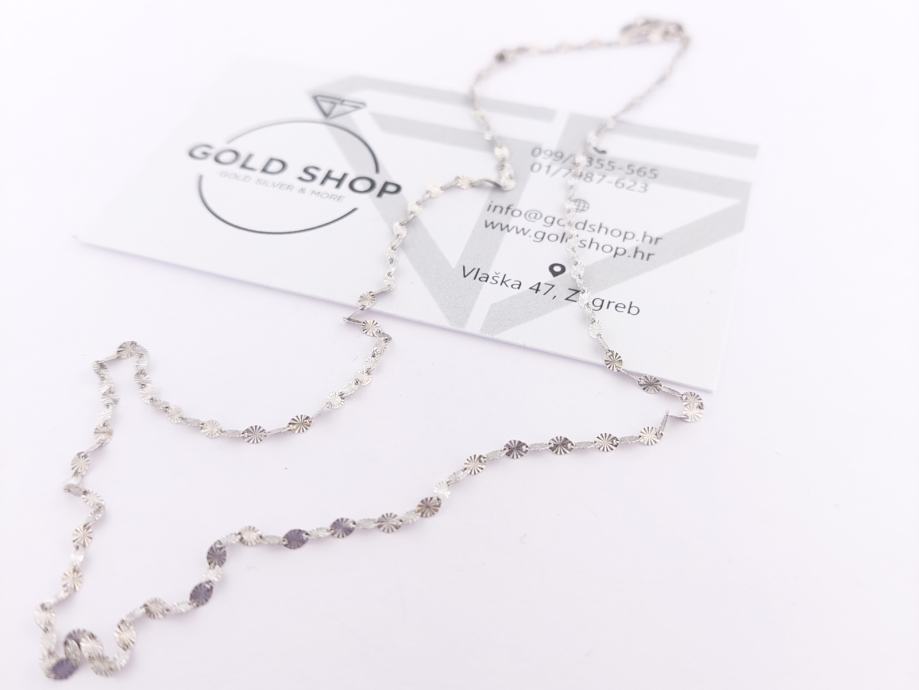 Zlatna ogrlica, ženska, bijelo zlato 14K, žig 585, tanki nareckani listići u kare vez.