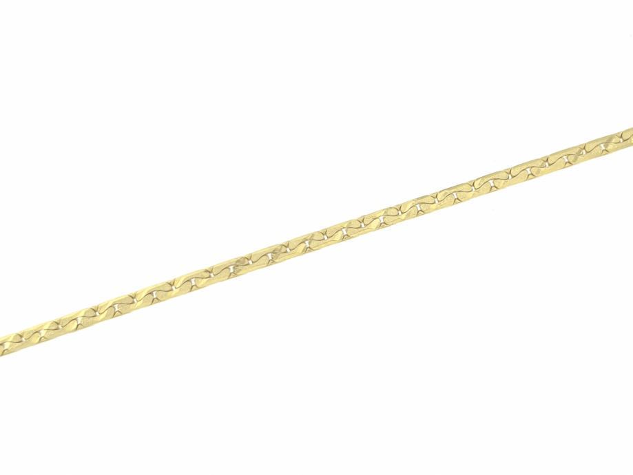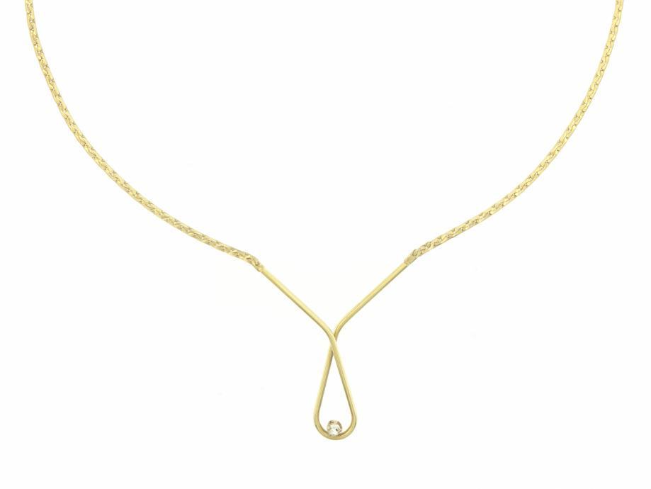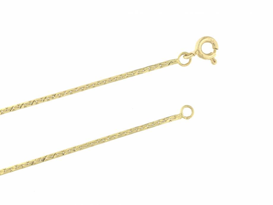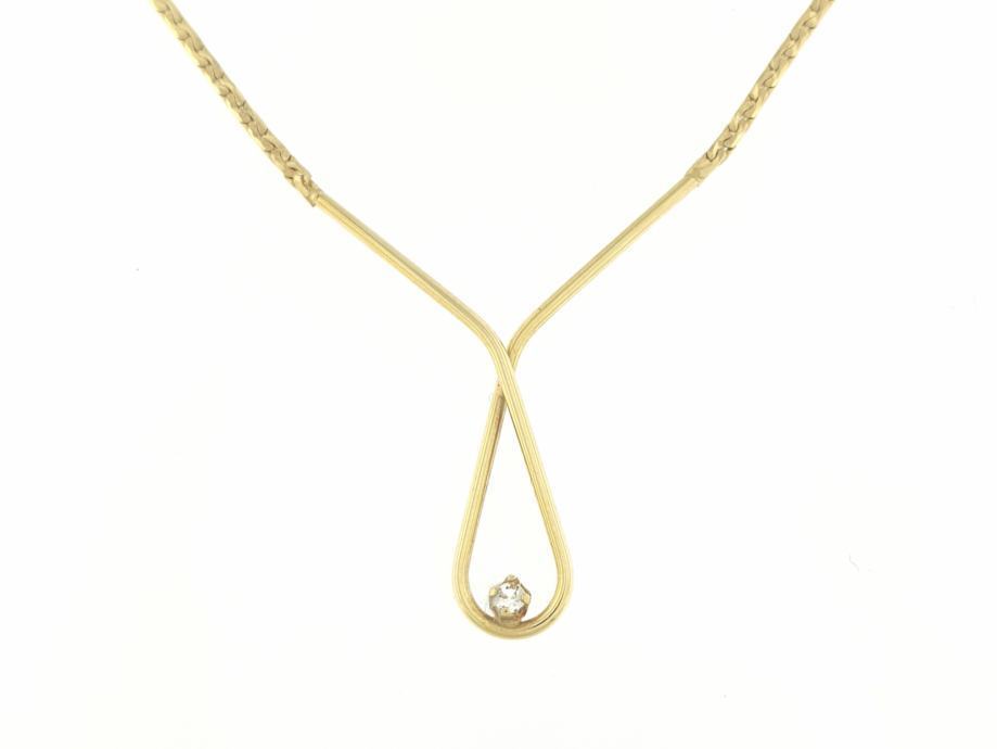 Zlatna ogrlica, ženska, žuto zlato 14K, žig 585, tanki flah lančić, na sredini fiksni privjesak s jednim bijelim cirkonom.