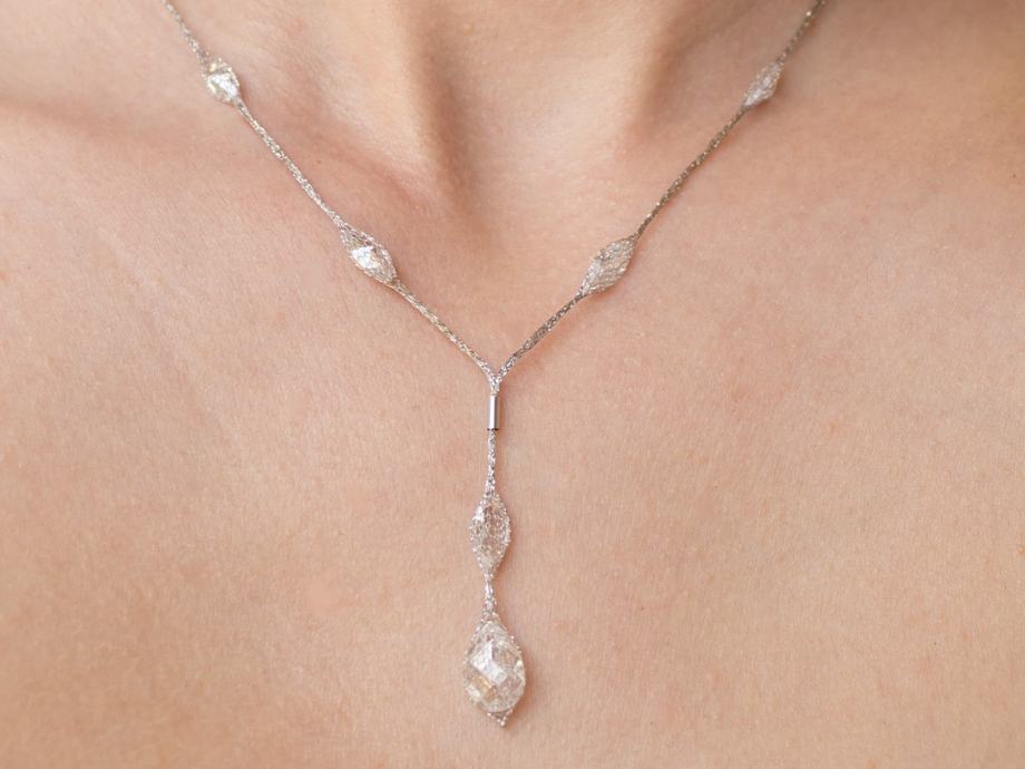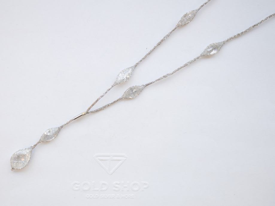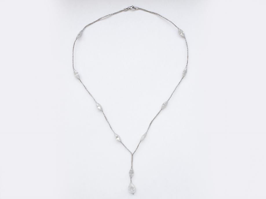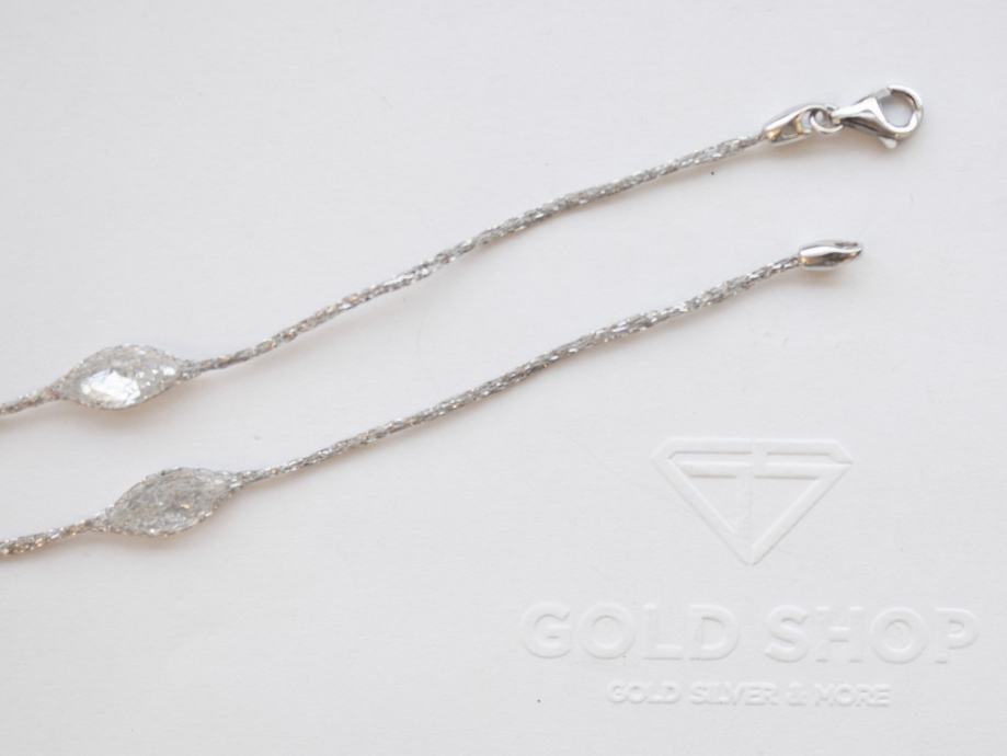Zlatna ogrlica, ženska, bijelo zlato 14K, žig 585, mrežičasta, s 9 marquise cut bijelih cirkona + 1 veći pear cut bijeli cirkon.