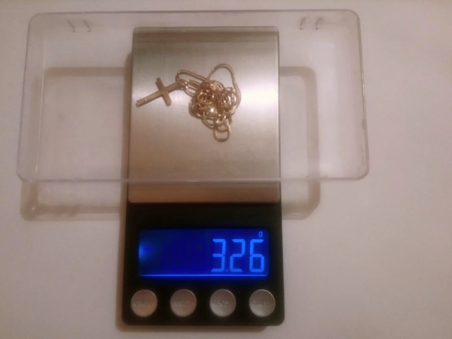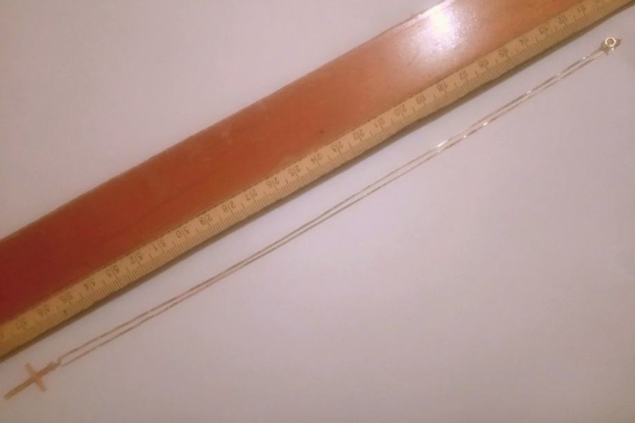 Duljina je oko 53 cm. Što se tiče čistoće zlata, gledao sam povećalom i čini se da i lančić i križić imaju žig 585, što bi bilo 14 karata, ali ne garantiram da su lančić i/ili križić toliko karata (ako ne toliko, onda vjerojatno više, ali možda i manje).