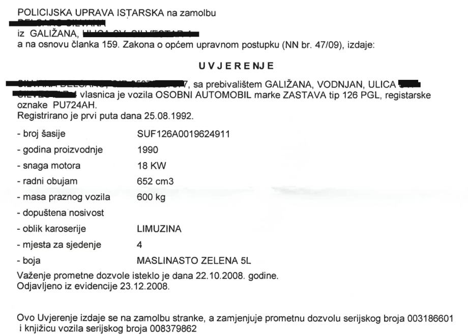 Drugi vlasnik automobila od 1997 godine, imam još kupoprodajni ugovor. Automobil je redovno registriran i sudjelovao u prometu do 2008 godine kada je odjavljen zbog kupnje novijeg. Auto se još kratko vozio lokalno do maslina i nakon odjave dok je akumulator radio; nakon toga stoji na istom mjestu i čeka bolje dane.