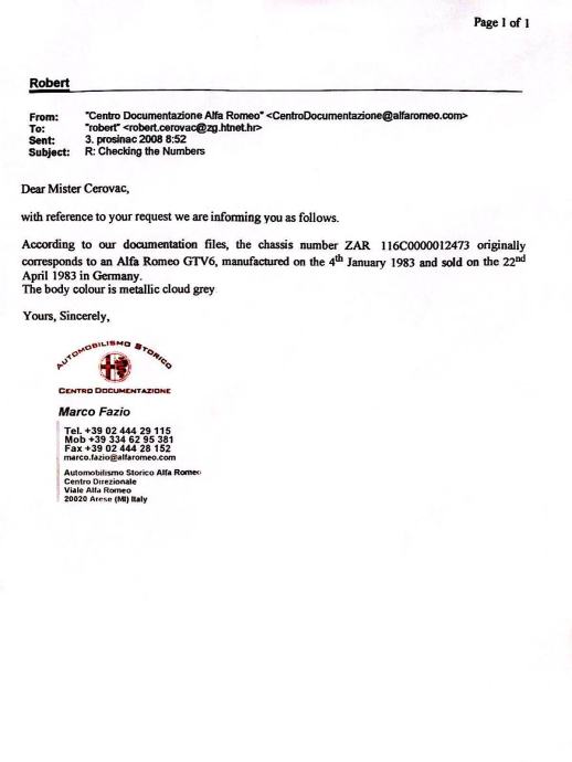 Alfetta gtv6, 1983, completely original 2nd series. Owned for over 20 years. Bodywork protected, no corrosion. Always garaged, always registered. Mechanically completely correct with new parts (bushes, ball joints, bearings, discs, pads, shock absorbers, springs...). The car comes on original Ronal A1, 7Jx15 rims. The price includes another 2.5l gtv6 engine in good condition, original dual-plate gearbox and a set of original Campagnolo wheels. Registration valid until April 2026. No tradeoffs.