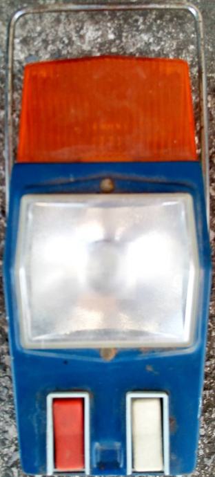 Stara lampa za signalizaciju kvara ili nesreće na cesti. Nedostaje kopča poklopca baterija, bijeli gumb u doljnjem položaju izgleda ne radi, hrđa na poklopcu.