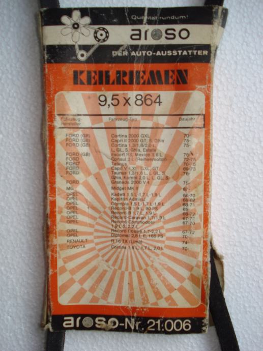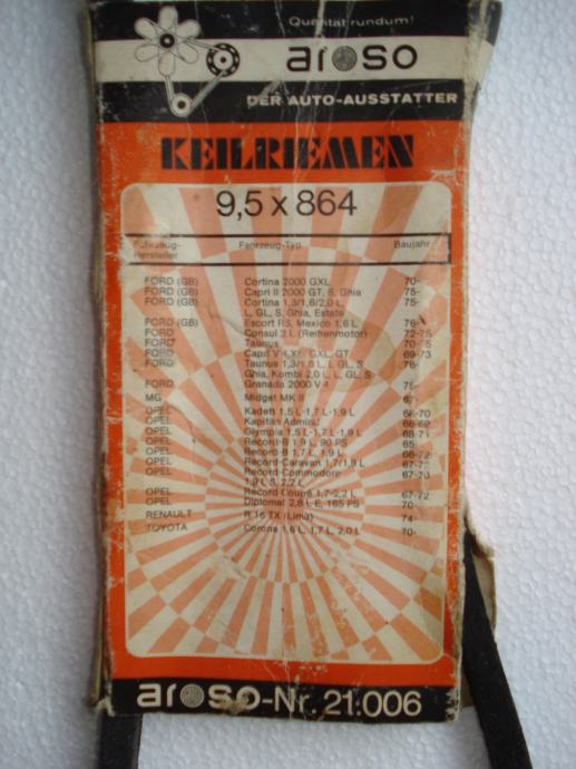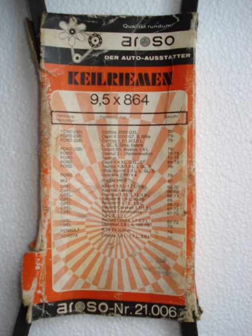 Klinasti / kanalni remen AROSO 9 Mo,5 x 864, aroso-Nr.21.006, ne korišten, za starije modele automobila iz 1970-80-ih godina, prodajem.