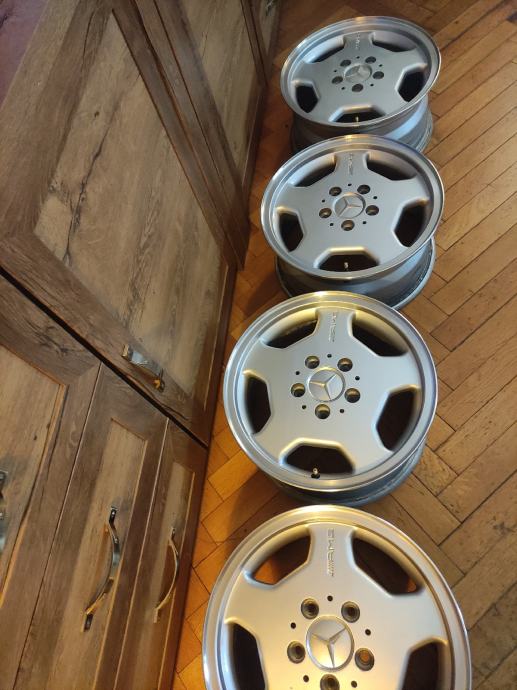 Mercedes alu felge 15 " AMG - monoblock ,orginalno stanje, prva boja, savršeno očuvane , orginal poklopci . 7Jx15H2ET37. Za oldtimer Mercedes org.W 202 . ( W 124, W 201 , W210 , W107 , W108 , W109 , W116 , W126,, SL ,, ) SET 1200 € . Zagreb