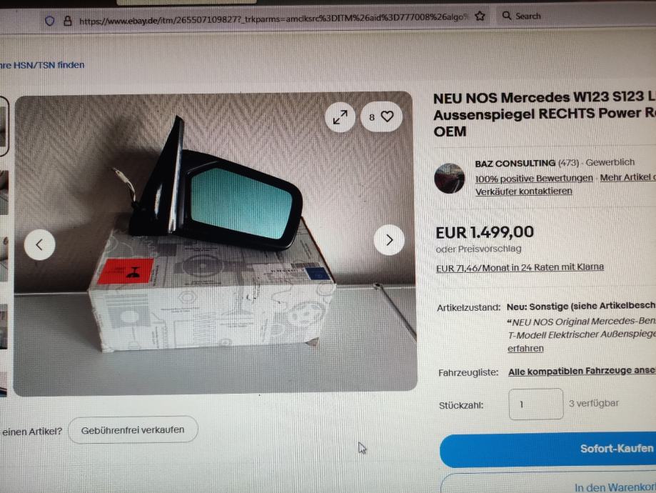 NOVO , NEW, NOS - NEW OLD STOCK . ORGINAL MB W123 , desni elek. retrovizor / No 123 811 ........ ... / . Zagreb