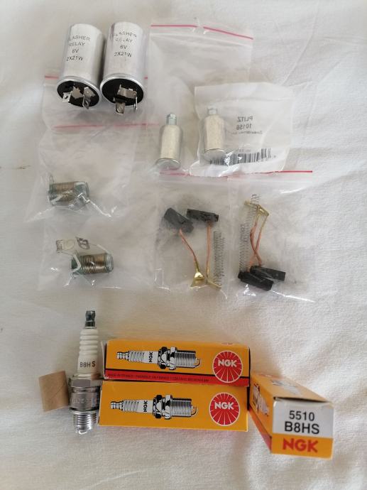 Kondezator, platine, zavojnica pobudna, četkice, automat žmigavaca, svjećice.