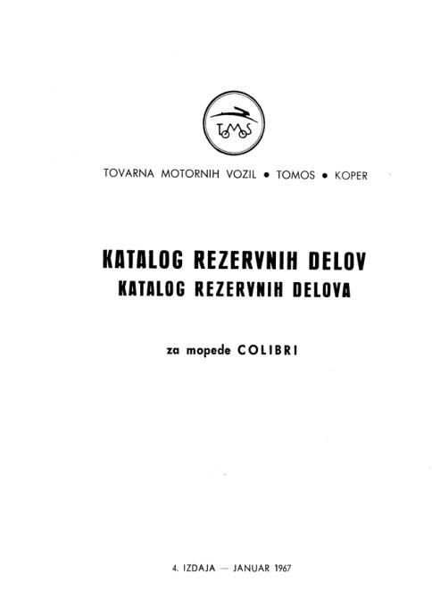 Prodajem katalog rezervnih dijelova za motor TOMOS COLIBRI - izdanje Tomos siječanj 1967. Katalog je na slovenskom/hrvatskom jeziku, 170 strana, detaljni crteži i opisi svih dijelova na tim mopedima. Digitalni pretisak vrhunske kvalitete.