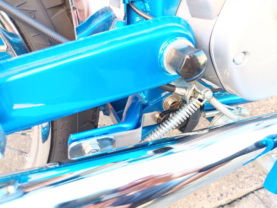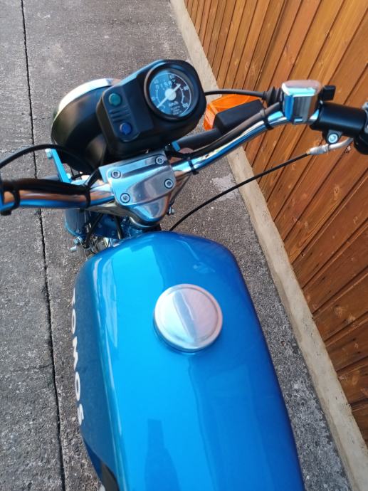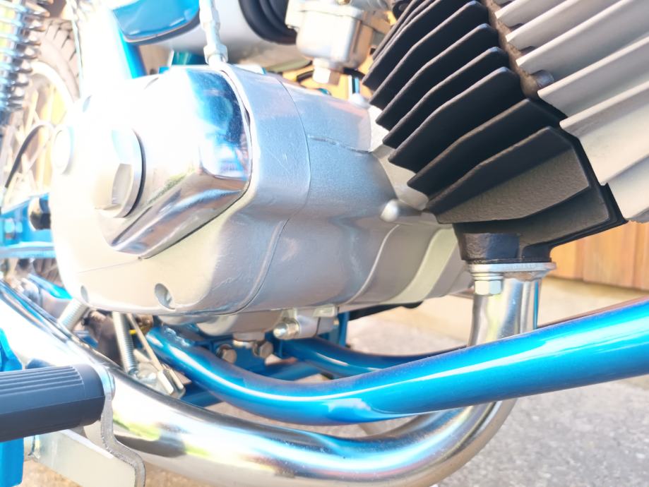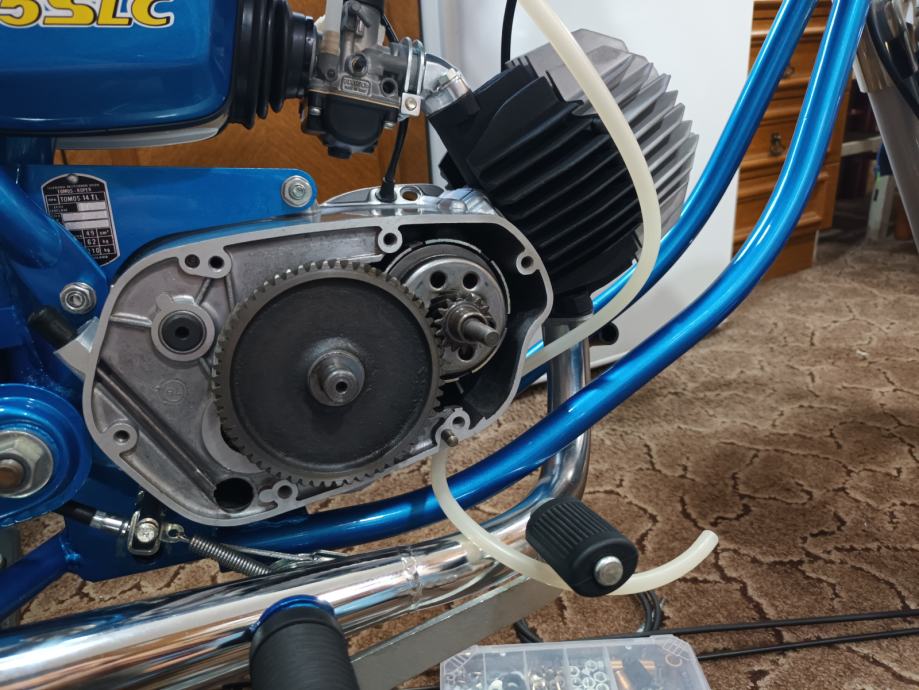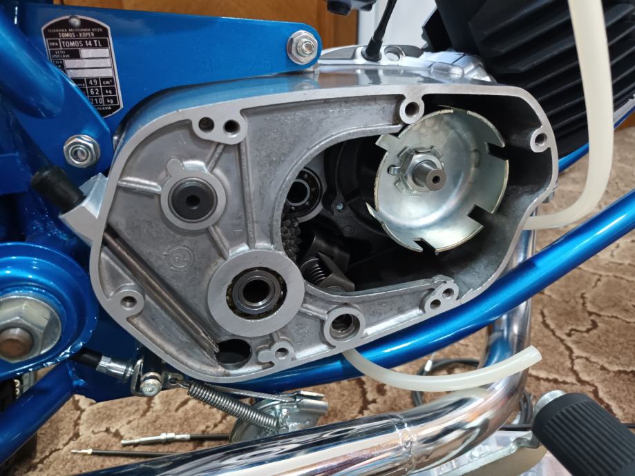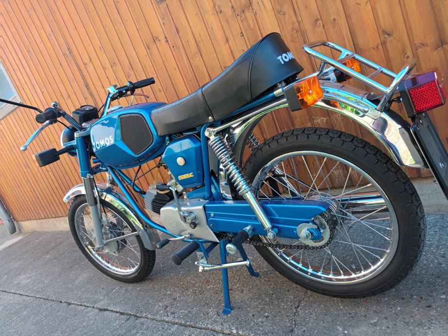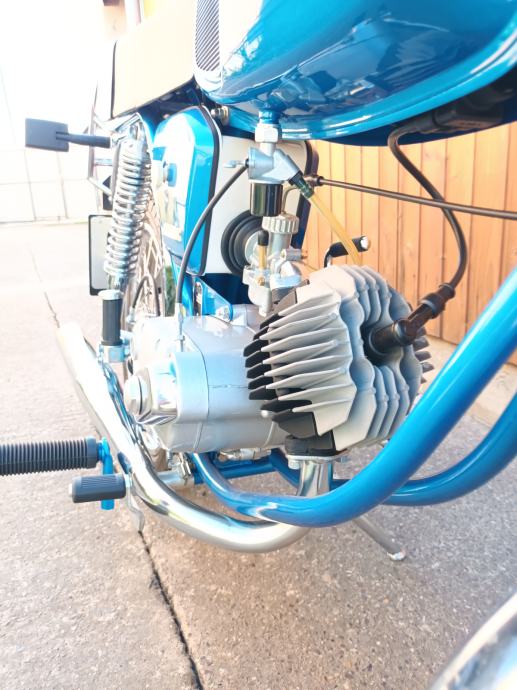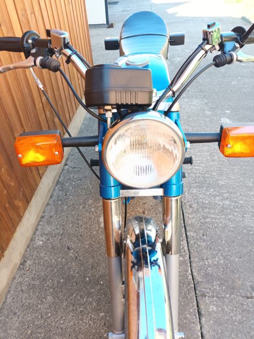 Tomos 14 TL kupljen od prvog vlasnika, sa knjižicom jamstvenog lista i prvog servisa iz 1979. godine. Motor je kao osnova za restauraciju bio jako uredan i originalno je sve bilo na njemu. Kompletno je pjeskaren, svi vijci (i navoji) temeljito pripremljeni i pocinčani, instalacija kompletno nova. Novi kromirani kvalitetni blatobrani, prednji far original Saturnus novi, bočni dekl paljenja u izuzetnom stanju kupljen, prednje vile T15 reparirane, prednji doboš od T15, cilindar od BT originalni, bušen na 39 mm, klip Vertex sa L karikom, originalna glava isto od BT-a, originalni Bing 18 karburator, rezervoar iznutra kao nov, Domino ručke u izuzetnom stanju bez luftova i nisu udarane i savijene, navlake za Domino ručke originalnog izgleda, originalan volan ponovno kromiran u Mađarskoj, ugrađeni žmigavci i originalno paljenje 12V 50W, prekidač stop svjetla originalan, sve nove sijalice, km sat, kučište km sata u neoštećenom stanju (nije ni sunca vidio) , kvalitetna km sajla nova. Brojevi na mašini, rami i pločici se poklapaju (original mašina), ugrađena 5. brzina, nova radilica CKR 12mm, svi ležaji, brtve i semerinzi u mašini i na kotačima novi. Uz motor dajem i njegove originalne prednje vile sastavljene i lakirane u istu boju, zadnji blatobran i nosače u boji te prednji blatobran u primeru. Motor lijepo radi, ima ler, odlično ide. Registriran je do 8.2025. na moje ime te je prijepis obvezan. Velika tablica (motocikl) kako se i vodi u papirima od prvog dana.