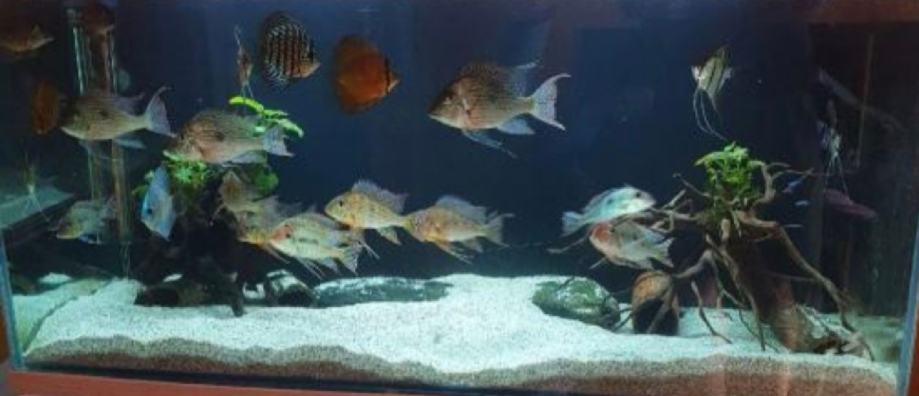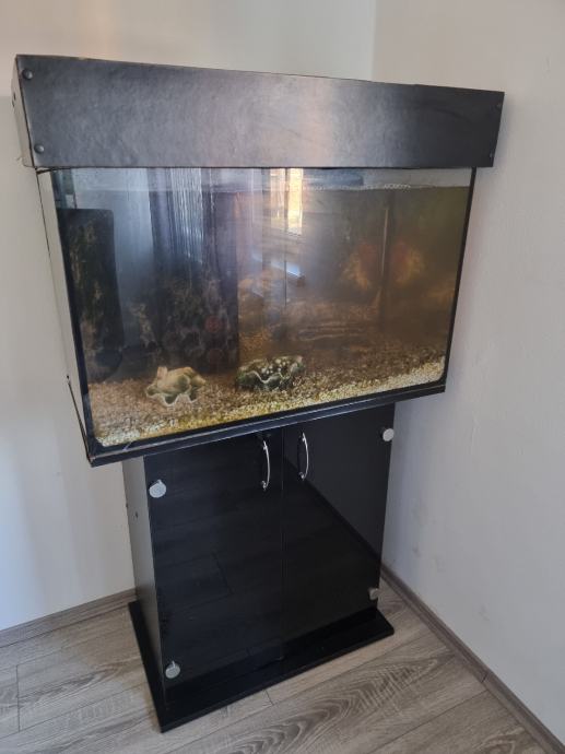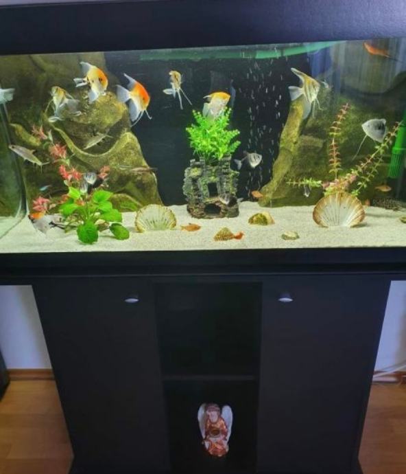 prodajem akvari 200 litara sa postoljem pumpom filterima i rasvjetom zlatnim ribicama ćistaćima biljkama ukrasima