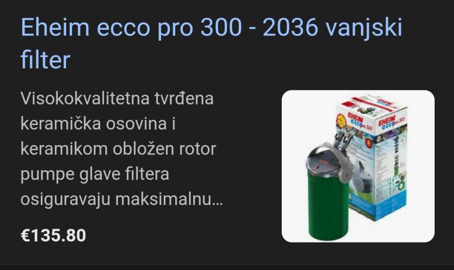 Prodajem EHEIM akvarij 120 L s dva vanjska EHEIM filtera (Ecco Pro 300 i Ecco Pro 200). Akvarij nije dugo korišten, očuvan je i potpuno ispravan.
