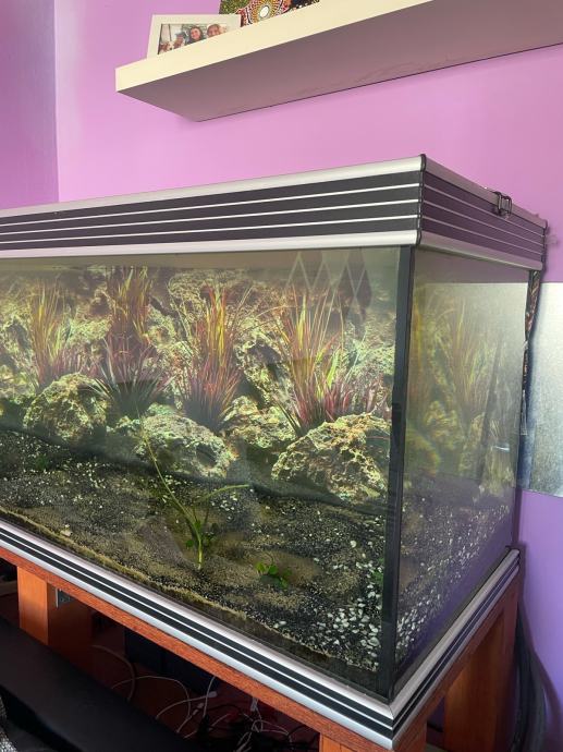 Uz akvarij u setu dolazi unutarnji filter, 4 neonske lampe u krovu i grijač, te dodatno ako želite i stalaža na kojoj se sada nalazi. Stalaža je napravljena od greda punog drva i osb ploča - preživjelo je potres bez problema.