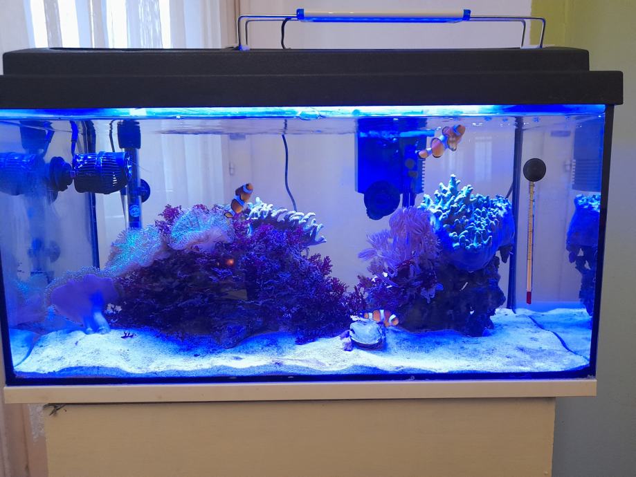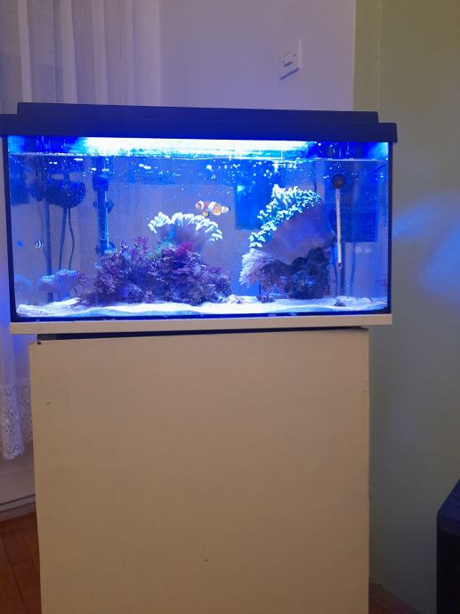Kompletan akvarij sa postoljem i svom opremom, služio za morske ribe, može i za slatkovodne.